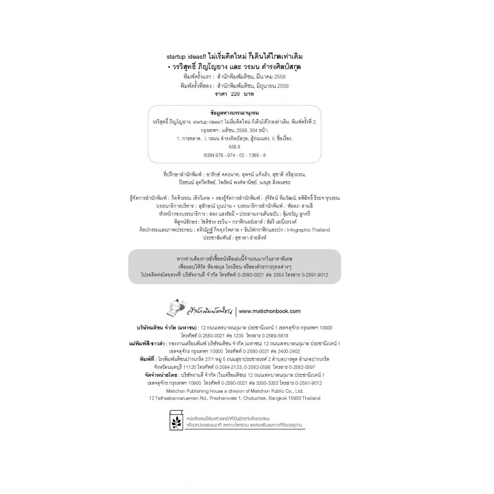 อย่ามัวแต่ใช้เวลาเกือบทั้งคนไปกับการ "คิดถึง" ชีวิตที่ดี ก่อนจะใช้เปอร์เซ็นต์น้อยๆ ที่เหลือของชีวิตลงมือทำให้เป็นจริง ในรอบหลายปีที่ผ่านมา มีกลุ่มธุรกิจผุดขึ้นมามากมาย ไม่ต่างอะไรกับดอกเห็ดในหน้าฝน ทั้งกลุ่มธุรกิจ SMES กลุ่มธุรกิจบริษัทเอกชนขนาดใหญ่ ไปจนถึงกลุ่มธุรกิจที่มาแรงในตอนนี้ นั่นคือ "Startup" ซึ่งก็คือ บริษัทเกิดใหม่ หรือกลุ่มคนที่รวมตัวกันเพื่อค้นคว้า วิจัยและพัฒนาผลิตภัณฑ์หรือบริการใหม่ๆ ที่มีรูปแบบของธุรกิจที่เหมาะสม ซึ่งสามารถทำการตลาดและสร้างการเติบโตอย่างก้าวกระโดดได้ ต้นทุนการทำ Startup จึงไม่สูงมาก เพราะอาศัยเพียงแค่แรงกาย และสมอง ที่ออกมาจากไอเดียของผู้ประกอบการเป็นหลัก นั่นคือสิ่งที่ มาร์ก ซัคเคอร์เบิร์ก, ริชาร์ด แบรนด์สัน และซีอีโอ Startup ระดับโลกคิด ถ้าวันนี้เราก้าวได้เพียงก้าวเล็กๆ การเปลี่ยนวิธีคิด อาจจะทำให้เราก้าวไปได้ไกลกว่าเดิม Startup ที่เริ่มต้นด้วย "ไอเดีย" และ ขับเคลื่อนธุรกิจด้วยการ "ลงมือทำ" และ "Startup Ideas ไม่เริ่มคิดใหม่ ก็เดินได้ไกลเท่าเดิม" เล่มนี้ จะมาเผยเคล็ดลับการทำธุรกิจที่มี "ความฝัน ไอเดีย และการลงมือทำ" เป็นต้นทุนให้กับคุณ