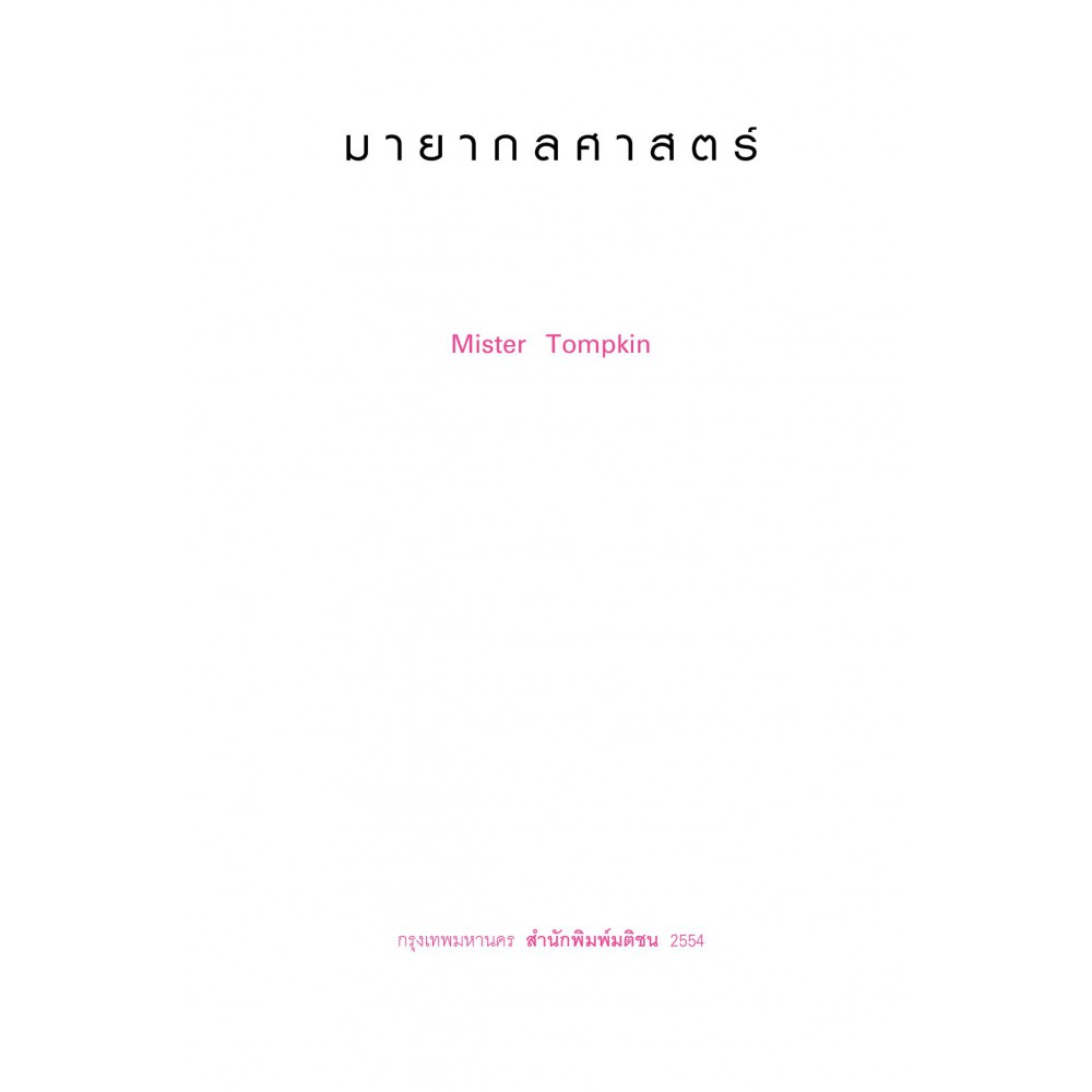 "มายากลศาสตร์" เล่มนี้ เฉลยเรื่องพิศดาร ปรากฏการณ์อัศจรรย์ ด้วยหลักฟิสิกส์สุดหรรษา จาก "Mister Tompkin" ชายหนุ่มสัญชาติไทยผู้หลงใหลในวิทยาศาสตร์ ที่มุ่งศึกษาค้นคว้าและถ่ายทอดวิชาฟิสิกส์สู่สายตาผู้อ่าน ซึ่งความโดดเด่นในงานเขียนสไตล์มิสเตอร์ทอมกิ้นนี้ คุณไม่จำเป็นต้องมีความรู้ทางวิทยาศาสตร์ที่ล้ำลึก ก็สามารถเข้าใจและเพลิดเพลินได้ ด้วยสำนวนภาษที่เป็นกันเอง อธิบายทฤษฎีให้เข้าใจได้ด้วยมุมมองที่เปิดกว้างต่อคำถามระดับมนุษยชาติ โดยแต่ละเรื่องที่นำเสนอ ให้สาระแง่คิดที่คุณผู้อ่านนำไปต่อยอดในองค์ความรู้อื่นๆ ได้อีกหลากหลาย เพราะในยุคที่เทคโนโลยีก้าวล้ำทุกขณะ ส่งผลให้ความรู้และวิทยาการได้รับการพัฒนาให้ก้าวหน้าทุกวินาที สิ่งที่เราไม่รู้ในวันวาน กำลังถูกค้นคว้าหาคำตอบในวันนี้ ทำให้ความรู้ความเข้าใจที่เคยยึดถือตามหลักการเดิมนั้น สามารถเปลี่ยนแปลงเป็นความรู้ใหม่ที่ผ่านการพิสูจน์จากผู้เชี่ยวชาญ