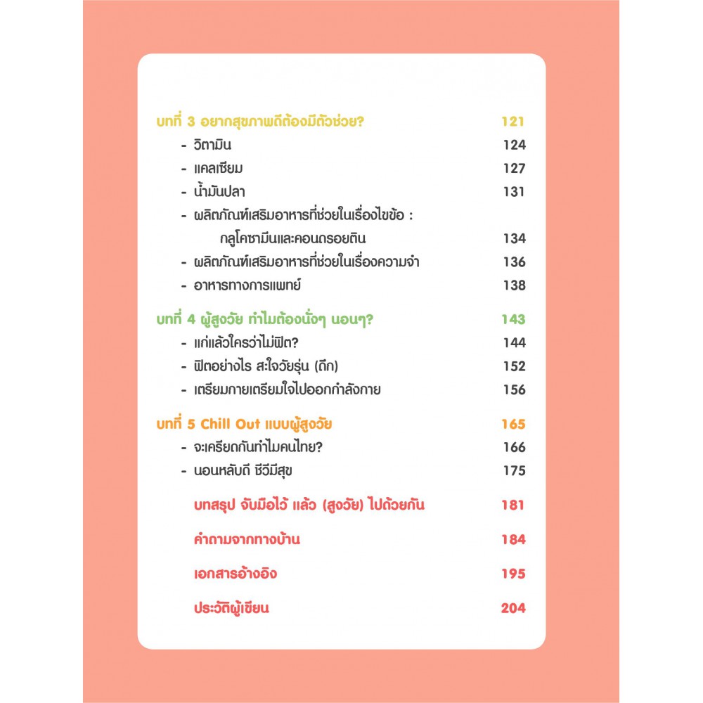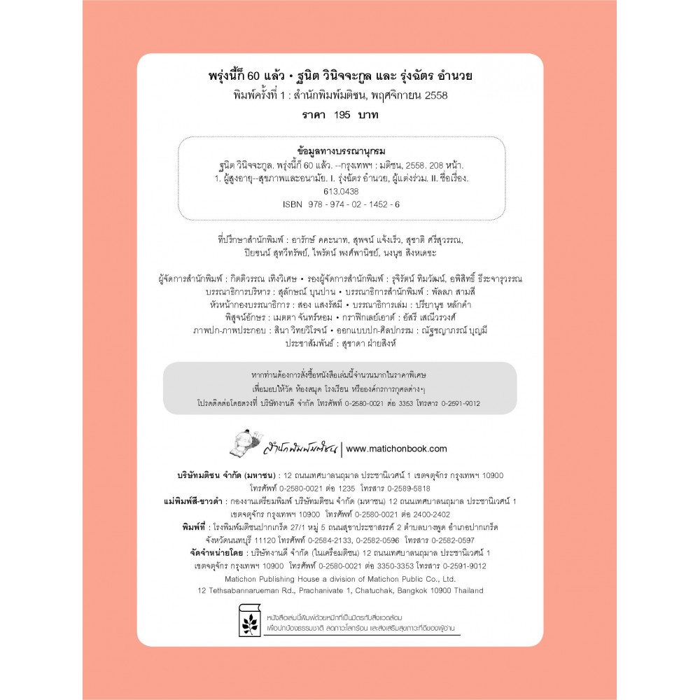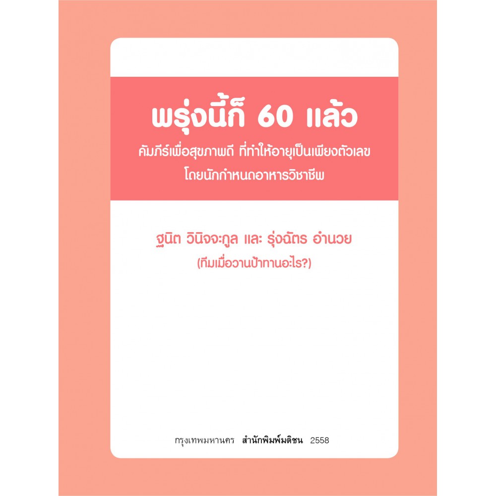 พรุ่งนี้ก็ 60 แล้ว คัมภีร์เพื่อสุขภาพดี สำหรับผู้สูงวัยหัวใจยังฟิตเปรี๊ยะ! ที่จะทำให้อายุกลายเป็นเพียงตัวเลข เเละรื่นรมย์ไปกับชีวิตที่มีคุณภาพ ผู้เขียน ฐนิต วินิจจะกูล,รุ่งฉัตร อำนวย "พรุ่งนี้ก็ 60 แล้ว" หนังสือเกี่ยวกับการดูแลสุขภาพกายและสุขภาพใจสำหรับผู้สูงอายุ เอาชนะ "ภัยร้าย" ของผู้สูงวัยด้วยหลักโภชนาการที่ถูกต้อง และเคล็ดลับการใช้ชีวิตให้มีสุขภาพดี จากคำแนะนำของนักกำหนดอาหารวิชาชีพ ที่เคยออกผลงานหนังสือแนวโภชนาการมาแล้ว 2 เล่ม คือ "เมื่อวานป้าทานอะไร?" กับ "ซูเปอร์ป้าไดอารี่" ในเล่มนี้พวกเขาขอกลับมาอีกครั้งกับวิธีการดูแลสุขภาพผู้สูงอายุที่อ่านสนุก เข้าใจง่าย และช่วยนำพาผู้สูงวัยให้มีคุณภาพชีวิตที่ดีขึ้นแบบยั่งยืน สารบัญ บทที่ 1 ความเเก่เป็นเรื่องธรรมชาติ บทที่ 2 อาหารดี ชีวิตดี บทที่ 3 อยากสุขภาพดีต้องมีตัวช่วย? บทที่ 4 ผู้สูงอายุ ทำไมต้องนั่งๆ นอนๆ? บทที่ 5 Chill Out เเบบผู้สูงวัย อาหารเพื่อสุขภาพ, การดูแลสุขภาพ, ส่งเสริมสุขภาพ, ผู้สูงอายุ, Ebook, matichon, bookcaze, สำนักพิมพ์มติชน