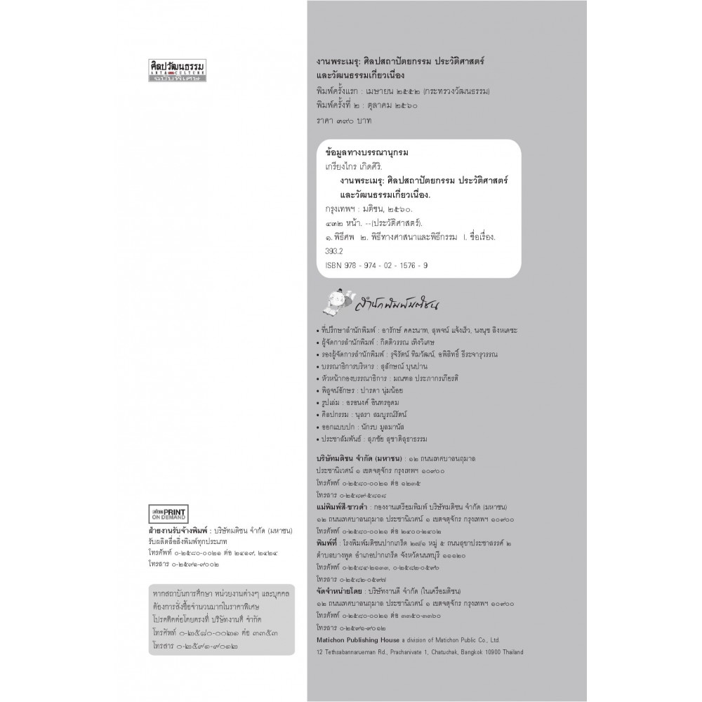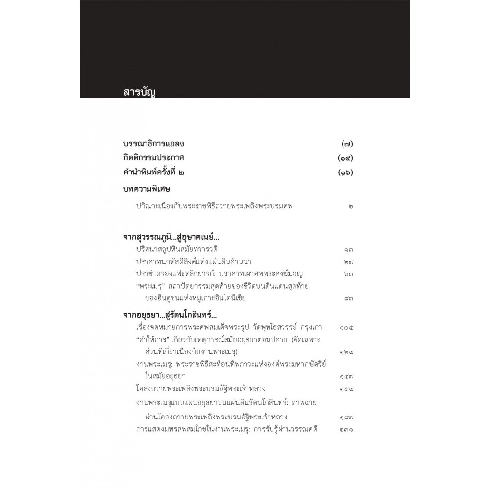 งานพระเมรุ : ศิลปสถาปัตยกรรม ประวัติศาสตร์ และวัฒนธรรมเกี่ยวเนื่อง เป็นผลิตผลของคณะนักวิชาการ ที่สนใจเรื่องสหวิทยาการมนุษยศาสตร์ที่เกี่ยวเนื่องกับ "งานพระเมรุ" แต่ยืนอยู่บนกรอบกว้าง ๆ ใน 2 ประเด็น คือ "พื้นที่" และ "เรื่องทางวัฒนธรรมที่เกี่ยวเนื่องกับงานพระเมรุ" ผู้เขียน ดร. เกรียงไกร เกิดศิริ ธรรมเนียมการปลงศพ มีมาแต่สมัยสุวรรณภูมิ อันเป็นการระลึกถึงผู้วายชนม์ที่ได้ถอดดวงจิตออกเดินทางไปสู่ภพภูมิใหม่ แสดงให้เห็นถึงพลังสำคัญที่ครอบทับจิตใจมนุษย์ก็คือ "ความรักและความผูกพัน" ของผู้ยังดำรงอยู่ที่มีต่อชีวิตอันเป็นที่รักได้จากไป ผ่านการจัดพิธีกรรมทรงพลังในการส่งบุคคลอันเป็นที่รักให้เดินทางไปสู่ภพภูมิใหม่ จากธรรมเนียมการปลงศพ สู่งานพระราชพิธีอันเกี่ยวเนื่องกับ "งานพระเมรุ" ในช่วงสมัยอยุธยาและรัตนโกสินทร์ หนังสือเล่มนี้ได้รวบรวมธรรมเนียมพระบรมศพ สถาปัตยกรรมพระเมรุมาศ และวัฒนธรรมร่วมในสุวรรณภูมิ ซึ่งไม่เพียงนำเสนอแค่พระราชพิธีของกษัตริย์เท่านั้น หากแต่ยังขยายประเด็นไปถึงสังคมพหุวัฒนรรมทุกพื้นที่ของอุษาคเนย์อีกด้วย สารบัญ บทความพิเศษ - ปกิณกะเนื่องกับพระราชพิธีถวายพระเพลิงพระบรมศพ จากสุวรรณภูมิ...สู่อุษาคเนย์ - ปริศนาสถูปหินสมัยทราวดี - ปราสาทนกหัสดิลิงค์แห่งแผ่นดินล้านนา - ปราศ่าดจองแฟะหลิกยาจก์: ปราสาทเผาศพพระสงฆ์มอญ - "พระเมรุ" สถาปัตยกรรมสุดท้ายของชีวิตบนดินแดนสุดท้าย ของฮินดูชนแห่งหมู่เกาะอินโดนีเซีย จากอยุธยา... สู่รัตนโกสินทร์ - เรื่องจดหมายการพระศพสมเด็จพระรูป วัดพุทไธสวรรย์ กรุงเก่า - คำให้การเกี่ยวกับเหตุการณ์สมัยอยุธยาตอนปลาย (คัดเฉพาะส่วนที่เกี่ยวเนื่องกับงานพระเมรุ) - งานพระเมรุ : พระราชพิธีสะท้อนทิพภาวะแห่งองค์พระมหากษัตริย์ในสมัยอยุธยา ฯลฯ เรื่องเล่าจากจิตรกรรมฝาผนัง : ภาพจิตรกรรมฝาผนังงานพระเมรุและเรื่องเกี่ยวเนื่อง - มหรสพสมโภช และการละเล่นในงานพระเมรุสู่งานจิตรกรรมฝาผนัง งานพระบรมศพพระพุทธเจ้าในจิตรกรรมสมัยรัตนโกสินทร์ - จิตรกรรมฝาผนังตอนถวายพระเพลิงพุทธสรีระในความสัมพันธ์กับคัมภีร์ทางศาสนา - บันทึกประวัติศาสตร์ในโลกจินตนาการ: พระเมรุในจิตรกรรมฝาผนังเรื่อง รามเกียรติ์ วัดพระศรีรัตนศาสดาราม