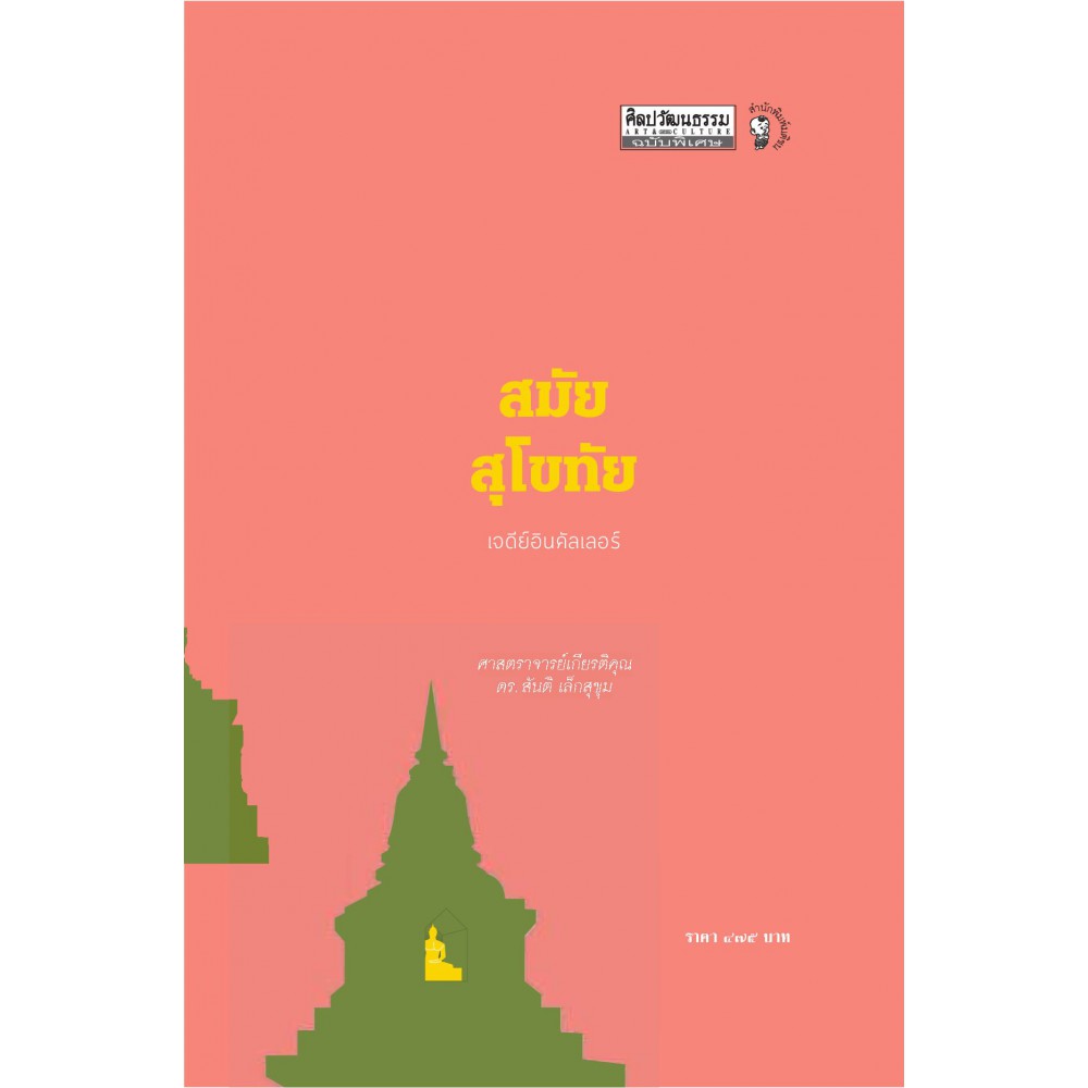 สมัยสุโขทัย เจดีย์อินคัลเลอร์ ผู้เขียนได้ใช้โปรแกรมสรรค์สร้างรูปทรงสันนิษฐานขึ้นมาใหม่ ให้เห็นถึงภาพชีวิตชีวาของเจดีย์แต่ละองค์ อันถือเป็นการต่อยอดแนวคิดองค์ความรู้อย่างไม่หยุดนิ่งเพียงแค่ข้อมูลวิชาการเท่านั้น ผู้เขียน ศ.เกียรติคุณ ดร. สันติ เล็กสุขุม ศิลปะสุโขทัย มีเอกลักษณ์เฉพาะ โดยปรับเปลี่ยนผสมผสานจากหลากรูปแบบ หลายแรงบันดาลใจ ลักษณะเฉพาะของบรรดาเจดีย์ในศิลปะสุโขทัย ทั้งในราชธานีและเมืองเครือข่าย ล้วนมีพัฒนาการเฉพาะตัว ขณะที่มีส่วนร่วมพัฒนาการกับเจดีย์ของแคว้นล้านนาและกรุงศรีอยุธยาด้วย ซึ่งสืบทอดรูปแบบรูปทรงมาสู่เจดีย์สมัยรัตนโกสินทร์ ราชธานีปัจจุบัน "เจดีย์ในสมัยสุโขทัย" เล่มนี้ มิได้มีเพียงซากปรักหักพังเท่านั้น หากแต่ผู้เขียนได้ใช้โปรแกรมสรรค์สร้างรูปทรงสันนิษฐานขึ้นมาใหม่ ให้เห็นถึงภาพชีวิตชีวาของเจดีย์แต่ละองค์ อันถือเป็นการต่อยอดแนวคิดองค์ความรู้อย่างไม่หยุดนิ่งเพียงแค่ข้อมูลวิชาการเท่านั้น สารบัญ 1. เจดีย์สมัยสุโขทัย - ภาพแสดงชื่อส่วนประกอบของเจดีย์สมัยสุโขทัย 2. สุโขทัยราชธานี - วัดมหาธาตุ สุโขทัย - วัดพระพายหลวง - ศาลตาผาแดง - วัดศรีสวาย ฯลฯ 3. ศรีสัชนาลัย ราชธานีคู่แฝด - วัดเจดีย์เจ็ดแถว - วัดช้างล้อม - วัดสวนแก้วอุทยานน้อย ฯลฯ 4. เมืองเครือข่าย : กำแพงเพชร พิษณุโลก กำแพงเพชร - วัดหนองลังกา - วัดช้างรอบ - วัดพระแก้ว ฯลฯ