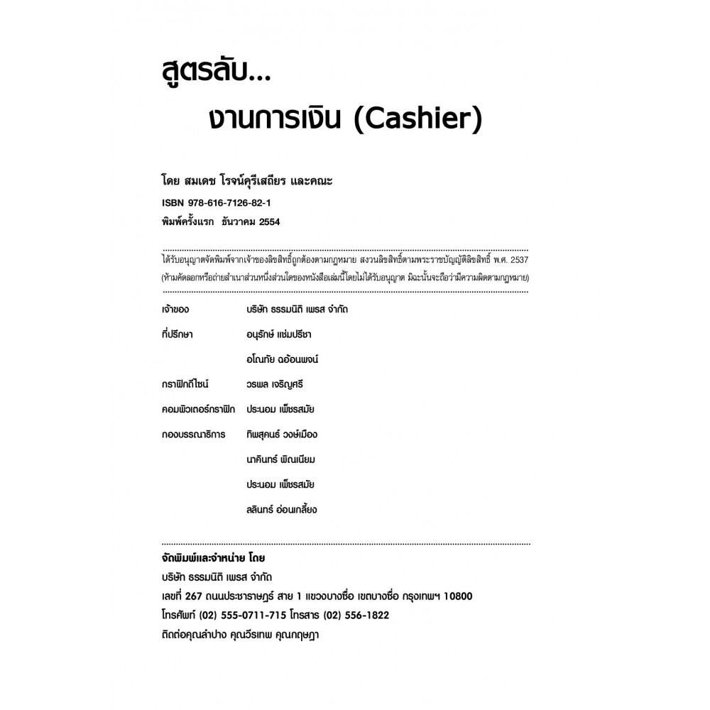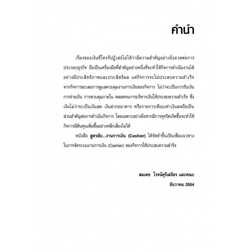 เรื่องของเงินที่ใครก็ปฏิเสธไม่ได้ว่ามีความสำคัญอย่างยิ่งยวดต่อการประกอบธุรกิจ ถือเป็นเครื่องมือที่สำคัญอย่างหนึ่งที่จะทำให้กิจการดำเนินงานได้อย่างมีประสิทธิภาพและประสิทธิผล "สูตรลับ..งานการเงิน (Cashier)" เนื้อหาในหนังสือเล่มนี้จะช่วยแนะแนวทางดารดูแลและควบคุมงานการเงินในกิจการของท่าน ทั้งเรื่องการจ่ายเงิน การรับเงิน ไม่ว่าจะเป็นเงินสด เงินฝากธนาคาร รายการเทียบเท่าเงินสด ฯลฯ เพื่อป้องกันมิให้เกิดการทุจริตในกิจการของท่าน