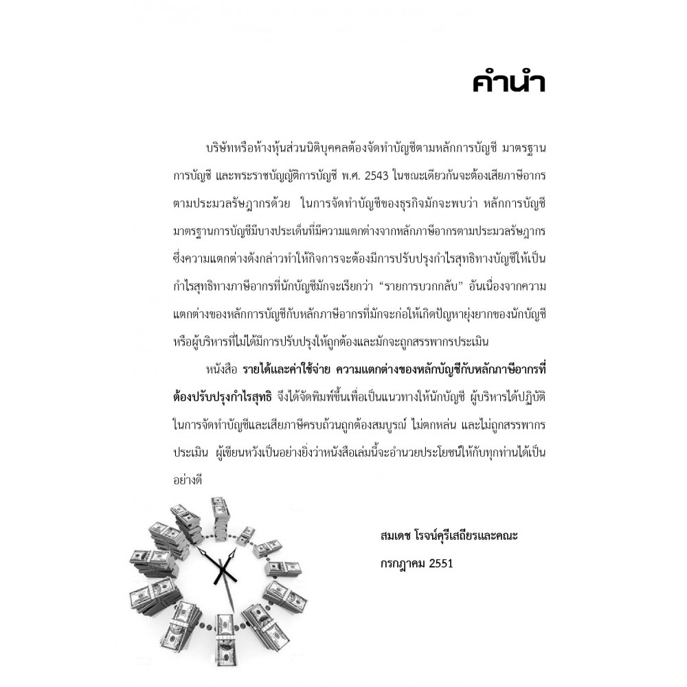 ในการจัดทำบัญชีของบริษัทหรือห้างหุ้นส่วนนิติบุคคล จะต้องจัดทำให้เป็นไปตามพระราชบัญญัติการบัญชี พ.ศ. 2543 ตามหลักการบัญชีที่รับรองทั่วไปและมาตรฐานการบัญชี อีกทั้งจะต้องเสียภาษีอากรตามประมวลรัษฎากรตามหลักเกณฑ์ เงื่อนไขและระยะเวลาที่กฎหมายกำหนด ปัญหาในการจัดทำบัญชีของธุรกิจมักจะพบว่า หลักการบัญชีและมาตรฐานการบัญชีมักจะมีบางประเด็นที่แตกต่างไปจากหลักเกณฑ์ทางภาษีอากรของประมวลรัษฎากร ความแตกต่างดังกล่าวทำให้ธุรกิจจะต้องมีการปรับปรุงรายได้และค่าใช้จ่ายที่จัดทำตามหลักการบัญชีและมาตรฐานการบัญชีให้ถูกต้องเป็นไปตามหลักเกณฑ์และเงื่อนไขของประมวลรัษฎากรหรือหลักภาษีอากรที่นักบัญชีมักเรียกว่า “รายการบวกกลับ” ที่ต้องปรับปรุงกำไรสุทธิทางบัญชีให้เป็นกำไรสุทธิทางภาษีอากร