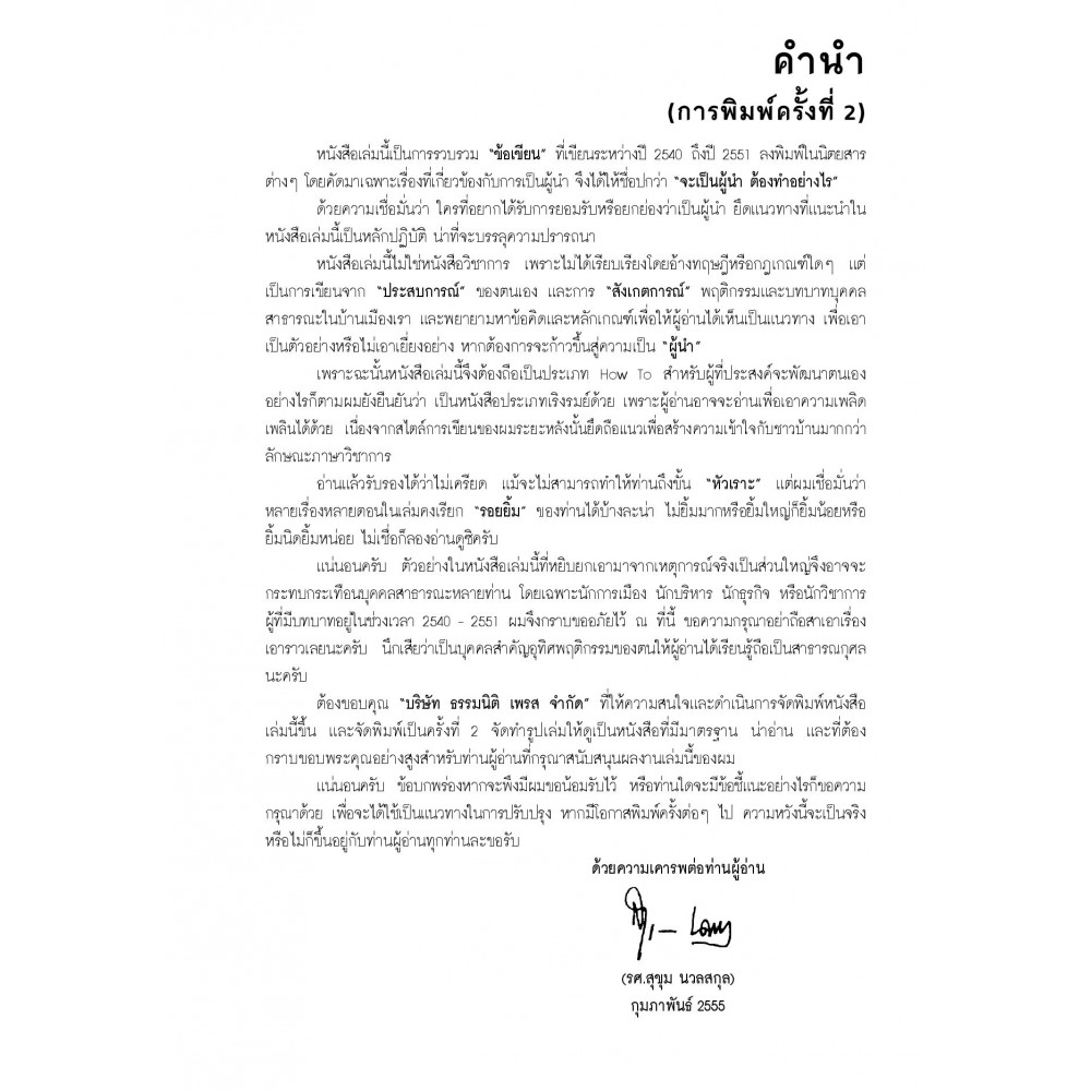 การรวบรวม “ข้อเขียน” ซึ่งเคยลงตีพิมพ์ในนิตยสารต่าง ๆ โดยคัดมาเฉพาะเรื่องที่เกี่ยวข้องกับการเป็นผู้นำ จึงได้ให้ชื่อปกว่า “จะเป็นผู้นำ ต้องทำอย่างไร” ด้วยความเชื่อมั่นว่า ใครที่อยากได้รับการยอมรับหรือยกย่องว่าเป็นผู้นำ ยึดแนวทางที่แนะนำในหนังสือเล่มนี้เป็นหลักปฎิบัติ น่าจะบรรลุความปรารถนา หนังสือเล่มนี้ไม่ใช่หนังสือวิชาการ เพราะไม่ได้เรียบเรียงโดยอ้างทฤษฎีหรือกฎเกณฑ์ใดๆ แต่เป็นการเขียนจากประสบการณ์ ของตนเอง และการ “สังเกตการณ์” พฤติกรรมและบทบาทบุคคลสาธารณะในบ้านเมืองของเรา และพยายามหาข้อคิดและหลักเกณฑ์เพื่อให้ผู้อ่านได้เห็นเป็นแนวทาง เพื่อเอาเป็นตัวอย่างหรือไม่เอาเยี่ยงอย่าง หากต้องการจะก้าวขึ้นสู่ความเป็น “ผู้นำ” เพราะฉะนั้นหนังสือเล่มนี้จึงต้องถือเป็นประเภท How To สำหรับผู้ที่ประสงค์จะพัฒนาตนเองอย่างไรก็ตามผมยังยืนว่า เป็นหนังสือประเภทเริงรมย์ด้วย เพราะผู้อ่านอาจจะอ่านเพื่อเอาความเพลิดเพลินได้ด้วย เนื่องจากสไตล์การเขียนของผมระยะหลังนั้นยึดถือแนวเพื่อสร้างความเข้าใจกับชาวบ้านมากกว่าลักษณะภาษาวิชาการ อ่านแล้วรับรองได้ว่าไม่เครียด แม้จะไม่สามารถทำให้ท่านถึงขั้น “หัวเราะ” แต่ผมเชื่อมั่นว่าหลายเรื่องหลายตอนในเล่มคงเรียก “รอยยิ้ม” ของท่านได้บ้างละน่า แน่นอนครับ ตัวอย่างในหนังสือเล่มนี้ที่หยิบยกเอามาจากเหตุการณ์จริงเป็นส่วนใหญ่จึงอาจจะกระทบกระเทือนบุคคลสาธารณะหลายท่าน โดยเฉพาะนักการเมือง นักบริหาร นักธุรกิจ หรือนักวิชาการ ผมจึงกราบขออภัยไว้ ณ ที่นี้ ขอความกรุณาอย่าถือสาเอาเรื่องเอาราวเลยนะครับ นึกเสียว่าเป็นบุคคลสำคัญอุทิศพฤติกรรมของตนให้ผู้อ่านได้เรียนรู้ถือเป็นสาธารณกุศลนะครับ