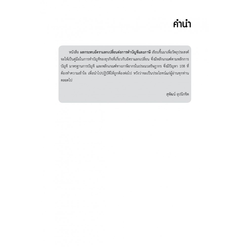 ระบบอัตราแลกเปลี่ยนเงินตรา -- กฎหมายเกี่ยวกับอัตราแลกเปลี่ยนเงินตรา -- หลักบัญชีเกี่ยวกับอัตราแลกเปลี่ยนเงินตรา -- หลักการนำเข้า-ส่งออก -- การปรับใช้ทางบัญชี -- ตอบข้อหารือและคำพิพากษาศาลฏีกา