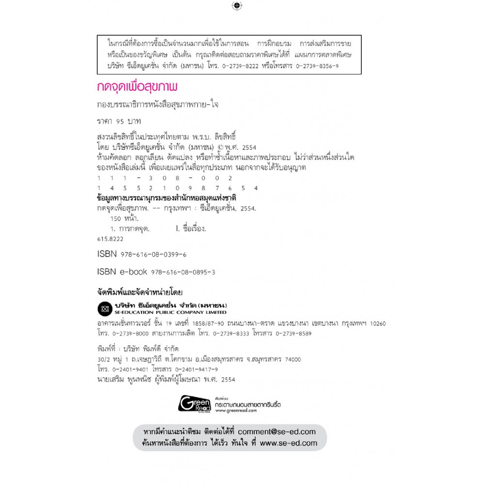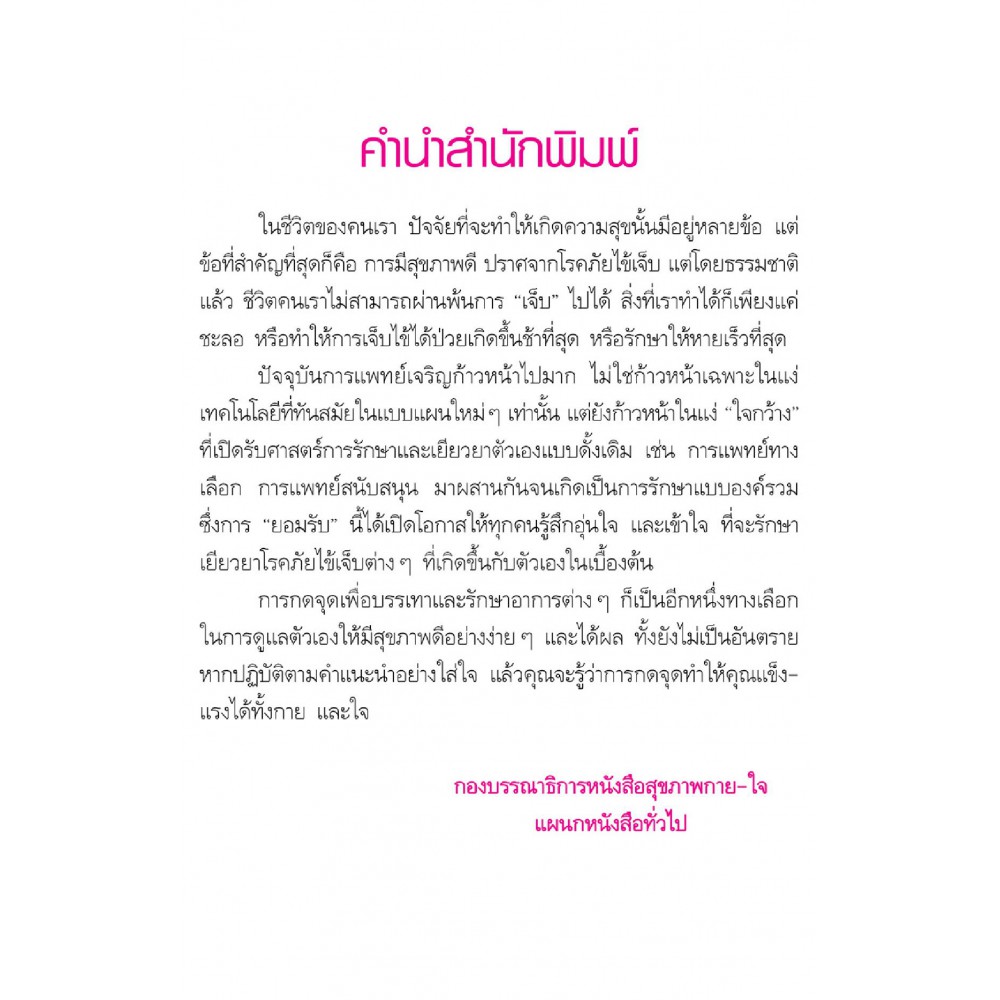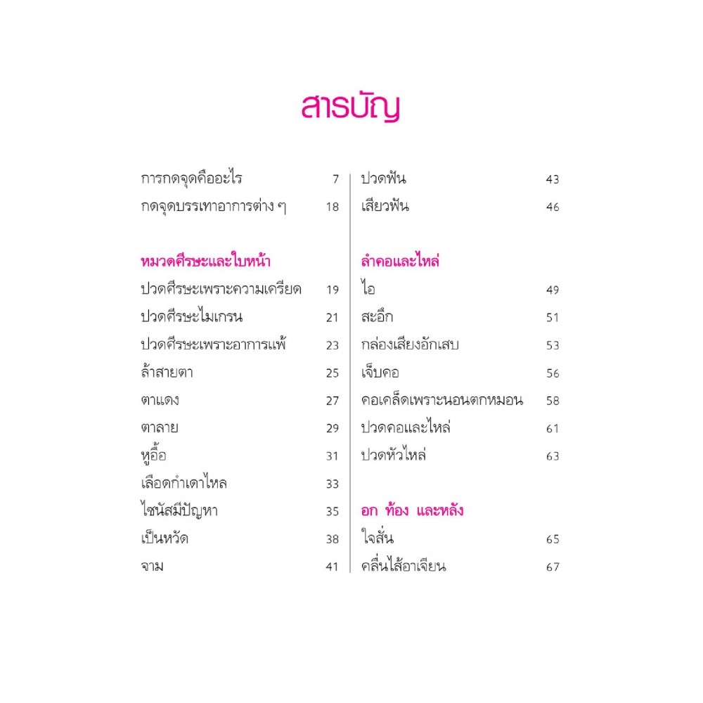 หนังสือแนะนำวิธีบรรเทาอาการ และรักษาสุขภาพด้วยตนเองโดยวิธีกดจุดบนร่างกาย ซึ่งเป็นศาสตร์โบราณของจีนที่พัฒนามาจากการฝังเข็ม เนื้อหาภายในได้อธิบายถึงการกดจุดอย่างครบถ้วน ตั้งแต่ประวัติความเป็นมา จุดต่างๆ ของร่างกาย การกดจุดในแต่ละลักษณะ และวิธีการกดจุดแบบง่ายๆ ที่ทำได้ด้วยตนเองเพื่อบรรเทาอาการผิดปกติต่างๆ เช่น ปวดหัว ปวดหลัง ปวดท้อง ปวดไหล่ คอเคล็ด เป็นหวัด ไอ สะอึก มึนศีรษะ ใจสั่น แก้ง่วง เป็นสิว เครียด และอีกหลากหลาย ซึ่งสารพัดโรคเหล่านี้สามารถบรรเทา ผ่อนคลาย ให้ดีขึ้นเป็นลำดับด้วยวิธีการ "กดจุด"