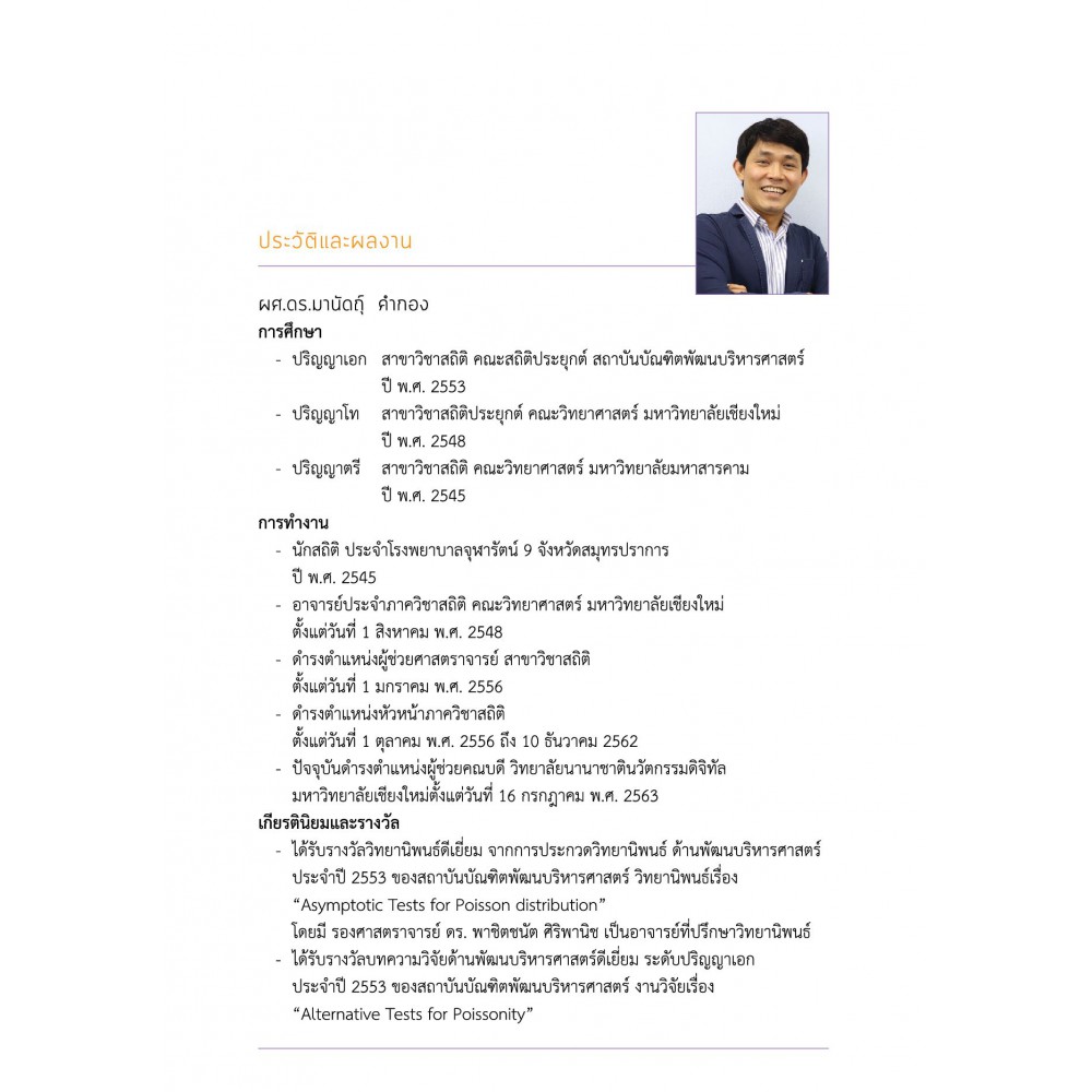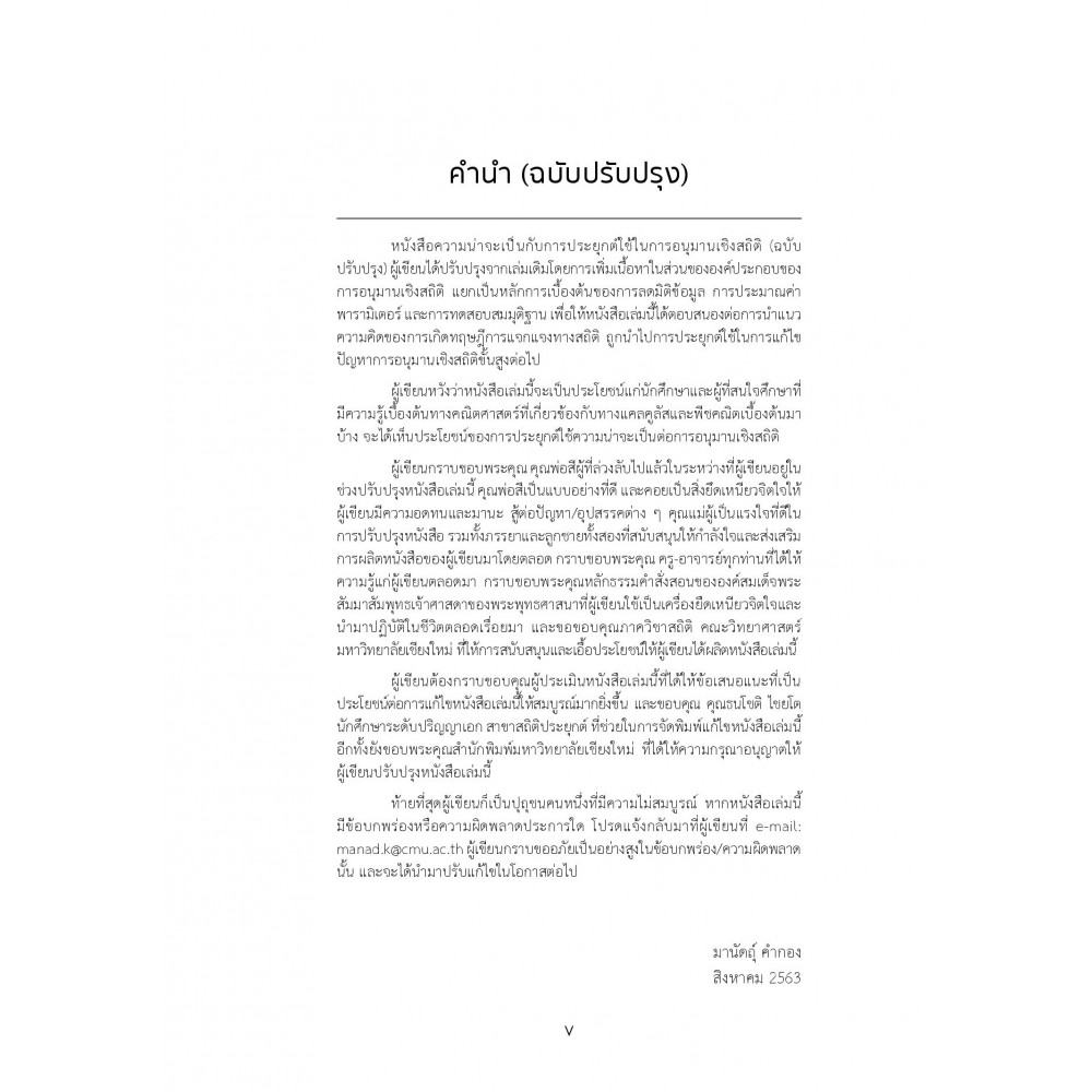 ความน่าจะเป็นเชิงสถิติ ฉบับปรับปรุง ข้อมูลการอนุมานเชิงสถิติอาศัยสารสนเทศที่ได้จากตัวอย่างสุ่มเพื่อสรุปเกี่ยวกับค่าพารามิเตอร์ที่ไม่ทราบค่าที่ผู้สนใจศึกษามีข้อสมมุติเกี่ยวกับฟังก์ชัน การแจกแจงความน่าจะเป็นของสิ่งที่สนใจศึกษาไว้ หนังสือเล่มนี้มุ่งเน้น การนำความน่าจะเป็นและสมบัติที่สำคัญ ที่จำเป็นต่อการอนุมานสถิติขั้นสูงต่อไป ไม่ว่าจะเป็นการประมาณค่าพารามิเตอร์แบบจุดและแบบ ช่วงการตั้งสมมุติฐานและการทดสอบสมมุติฐาน พร้อมทั้งการเสนอแนวทางในการประยุกต์ใช้ความน่าจะเป็น ในการอนุมานเชิงสถิติของผู้เขียนเป็นตัวอย่างประกอบ และการใช้โปรแกรมอาร์ช่วยอธิบายปัญหา สามารถใช้หนังสือเล่มนี้ เพื่อประกอบการศึกษาและการค้นคว้าเพิ่มเติมได้