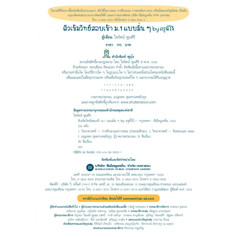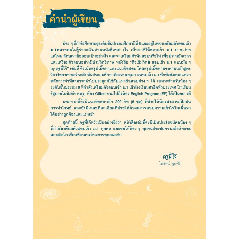 สรุปเนื้อหาสำคัญวิชาวิทยาศาสตร์ เพื่อสอบเข้า ม. 1 แบบเจาะลึก กระชับ อ่านเพลิน มีตารางและละภาพประกอบมากมาย ช่วยให้เข้าใจง่าย พร้อมแนวข้อสอบ 200 ข้อ ครอบคลุมการสอบเข้า ม.1 อีกทั้งยังสอดแทรกหลักการที่สามารถนำไปประยุกต์ใช้กับแนวข้อสอบต่างๆ เหมาะสำหรับน้องๆ ระดับชั้นประถม 6 ที่กำลังเตรียมตัวสอบเข้า ม.1 โรงเรียนสาธิตทั่วประเทศ โรงเรียนรัฐบาลในสังกัด สพฐ. ห้อง Gifted รวมไปถึงห้อง English Program ได้เป็นอย่างดี