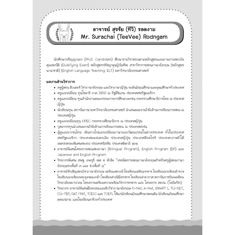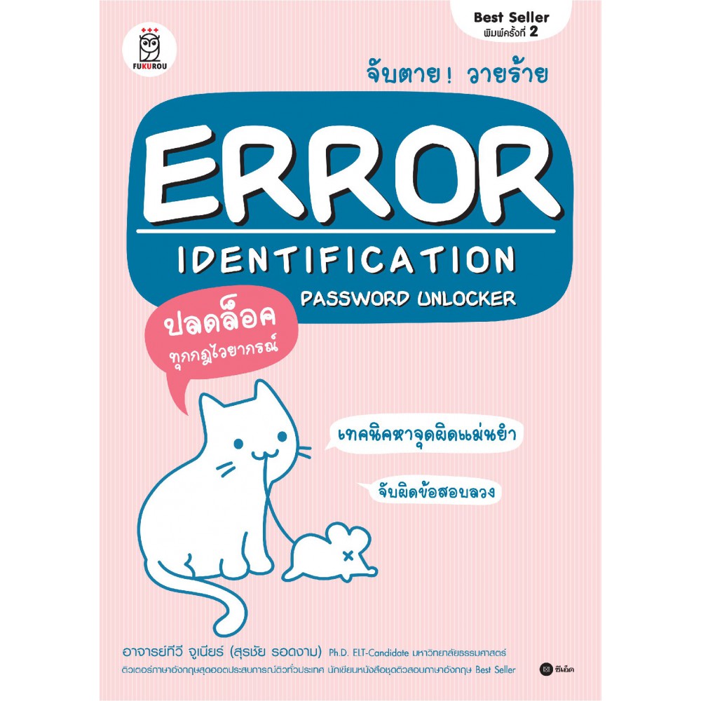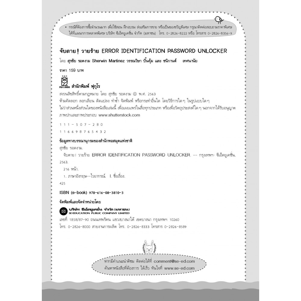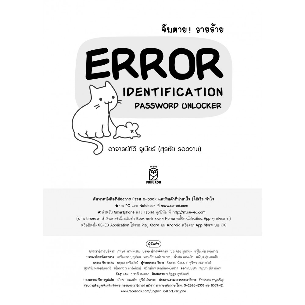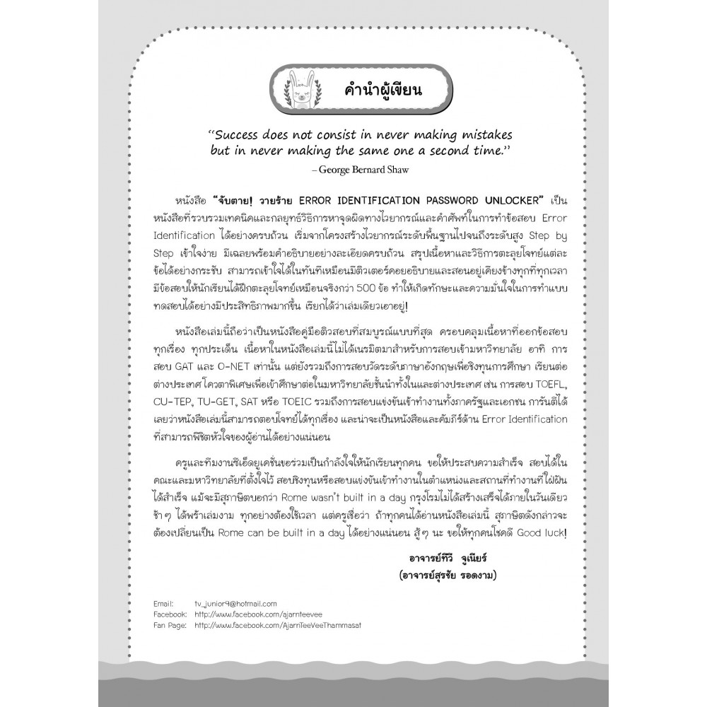 จับตาย! วายร้าย Error Identification Password Unlocker คู่มือเตรียมสอบวิชาภาษาอังกฤษ สอนเทคนิคและสรุปไวยากรณ์ภาษาอังกฤษ ครอบคลุมทุกหัวข้อที่เคยออกสอบ ตะลุยโจทย์ข้อสอบ ERROR IDENTIFICATION ทั้ง Sentence Correction และ Error Correction พร้อมเฉลยวิธีแก้ไขจุดผิดอย่างละเอียด ถือได้ว่าเป็นหนังสือคู่มือติวสอบที่สมบูรณ์แบบที่สุด ครอบคลุมเนื้อหาที่ออกข้อสอบทุกเรื่อง ทุกประเด็น เนื้อหาในหนังสือเล่มนี้ไม่ได้เนรมิตมาสำหรับการสอบเข้ามหาวิทยาลัย อาทิ การสอบ GAT และ O-NET เท่านั้น แต่ยังรวมถึงการสอบวัดระดับภาษาอังกฤษเพื่อชิงทุนการศึกษา เรียนต่อต่างประเทศ โควตาพิเศษเพื่อเข้าศึกษาต่อในมหาวิทยาลัยชั้นนำทั้งในและต่างประเทศ เช่น การสอน TOEFL, CU-TEP, TU-GET, SAT หรือ TOEIC รวมถึงการสอบแข่งขันเข้าทำงานทั้งภาครัฐและเอกชน สารบัญ - รู้ทันข้อสอบ คำตอบสู่มหาวิทยาลัยในฝัน - เคล็ดไม่ลับ จับตาย! วายร้าย Error Identification - Error Identification - Let s Sharpen Your Brain!! - Error Correction - Sentence Correction