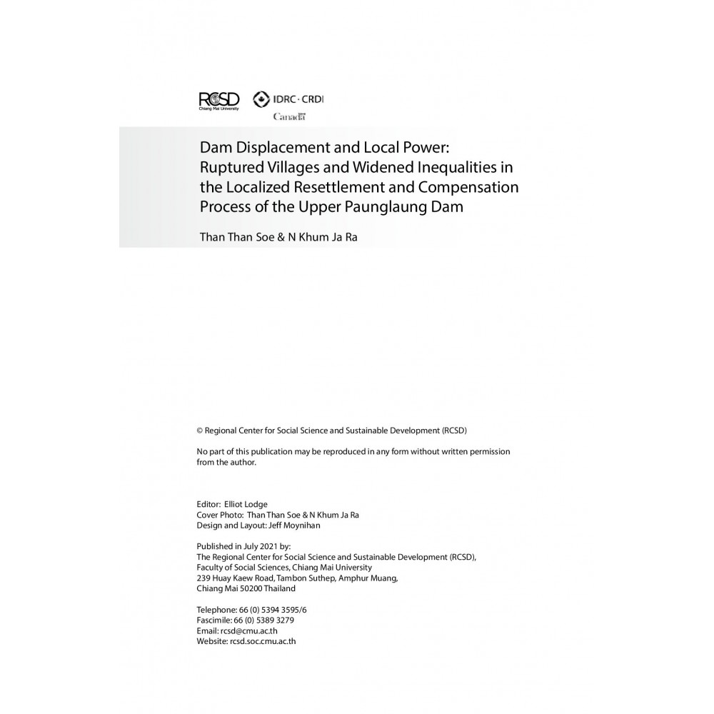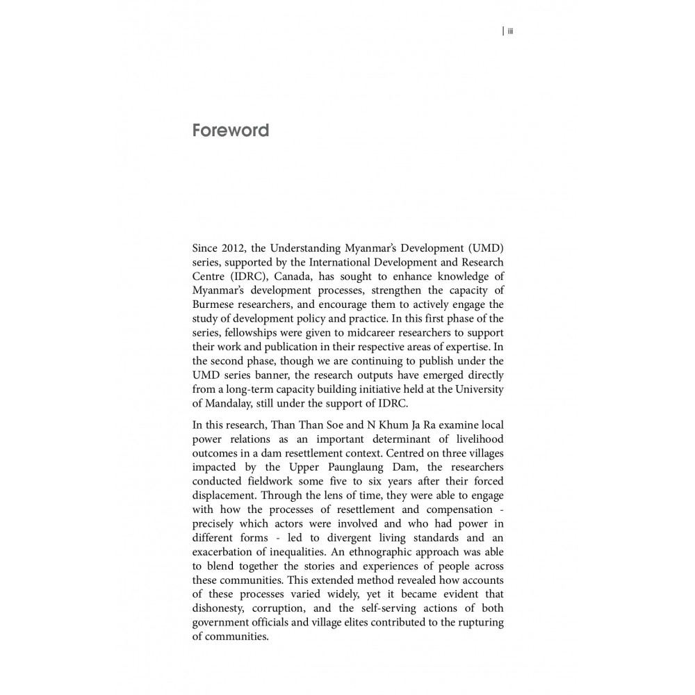 The government of Myanmar has begun building hydropower dams to meet the country’s growing demand for electricity; among them is the Upper Paunglaung Dam in Southern Shan State, home to mostly small Bamar villages. As construction was completed, two doz- en villages and around 8000 people were relocated and promised compensation. The re- search uncovered complex power relations between the government, the village chairman, village leaders and villagers throughout the process of compensation and relocation. While dynamics in each location varied, powerful, asset-rich people were the decision makers at the local level in almost all cases. Those with less power had little chance to join in the decision-making processes, and lacked the knowledge or capital to shift to new livelihoods. Inequality in these communities has been exacerbated by these unequal processes, and in many cases has led to devastating impacts. This monograph is a new critical perspective on dam projects and their impact in Myanmar, laying bare these local processes where corrup- tion and privilege remain rife.