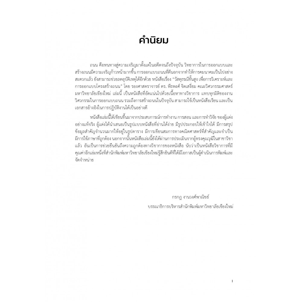 หนังสือเล่มนี้ถือได้ว่าเป็นบันไดขั้นแรกในการปูพื้นฐานสำหรับผู้อ่านเพื่อก้าวข้ามองค์ความรู้เชิงประจักษ์สู่แนวทางเชิงวิเคราะห์สำหรับการวิเคราะห์และออกแบบถนน ที่มีความซับซ้อนและต้องเกี่ยวพันกับการเปลี่ยนแปลงในมิติของปริมาณและน้ำหนักของยานพาหนะที่มากขึ้น รวมไปถึงสภาพภูมิอากาศที่เกี่ยวพันกับอุณหภูมิและความชื้นที่เปลี่ยนแปลงไป