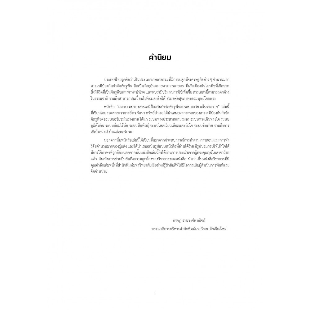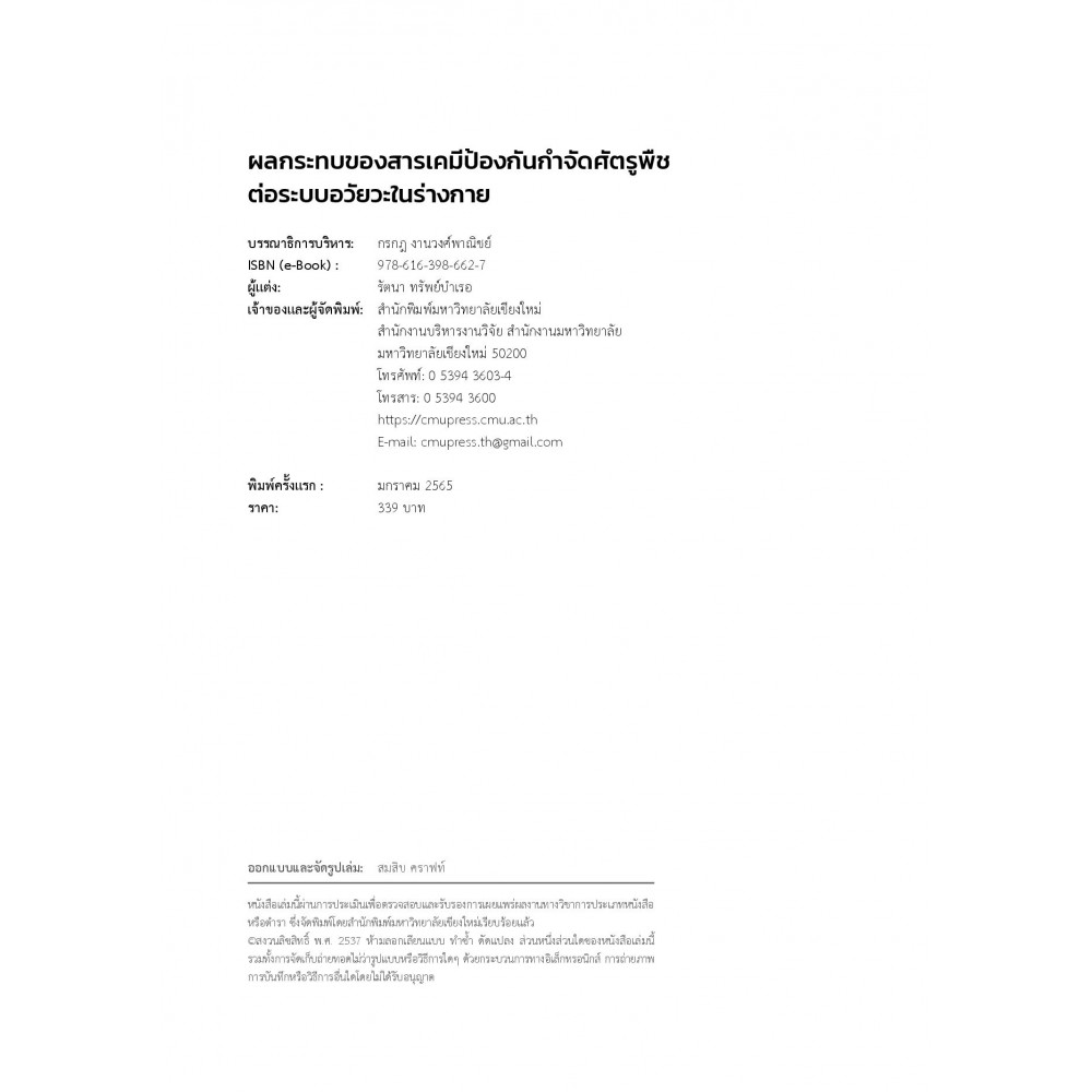 ผู้เขียนได้เรียบเรียงเนื้อหาผลกระทบของสารเคมีป้องกันกำจัดศัตรูพืชต่อระบบอวัยวะต่างๆ ในร่างกาย ได้แก่ ระบบประสาทและสมอง ระบบทางเดินหายใจ ระบบภูมิตุ้มกัน ระบบต่อมไร้ท่อ ระบบสืบพันธ์ุ ระบบไหลเวียนเลือดและหัวใจ ระบบขับถ่าย รวมถึงการเกิดโรคมะเร็งในระบบอวัยวะต่างๆ ซึ่งในแต่ละบทครอบคลุมถึงการทำงานของระบบอวัยวะ