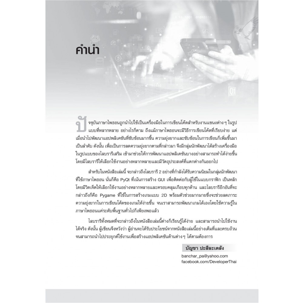 ในหนังสือเล่มนี้ จะกล่าวถึงไลบรารี 2 อย่างที่กำลังได้รับความนิยมในกลุ่มนักพัฒนาที่ใช้ภาษาไพธอน นั่นก็คือ PyQt ที่เน้นการสร้าง GUl เพื่อติดต่อกับผู้ใช้ในแบบกราฟิกเป็นหลัก โดยมีวิดเจ็ดให้เลือกใช้งานอย่างหลากหลายและครอบคลุมเกือบทุกด้าน และไลบรารีอีกอันที่จะกล่าวก็คือ Pygame ที่ใช้ในการสร้างเกมแบบ 2D พร้อมตัวช่วยมากมาย ซึ่งจะช่วยลดภาระความยุ่งยากในการเขียนโค้ดของเกมให้ง่ายขึ้น จนเราสามารถพัฒนาเกมเองได้โดยใช้ความรู้ในภาษาไพธอนแค่ระดับพื้นฐานทั่วไปก็เพียงพอแล้ว ไลบรารีทั้งหมดที่จะกล่าวถึงในหนังสือเล่มนี้ต่างก็เรียนรู้ได้ง่าย และสามารถนำไปใช้งานได้จริง ดังนั้น ผู้อ่านจะได้รับประโยชน์จากหนังสือเล่มนี้อย่างเต็มที่และครบถ้วน จนสามารถนำไปประยุกต์ใช้งานเพื่อสร้างแอปพลิเคชันด้านต่างๆ ได้ตามต้องการ