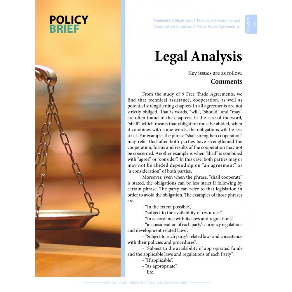 Thailand’s Utilization of Technical Assistance and Cooperation Chapters in Free Trade Agreements. From the study of 9 Free Trade Agreements, we find that technical assistance, cooperation, as well as potential strengthening chapters in all agreements are not strictly obliged. Publication date : 2558