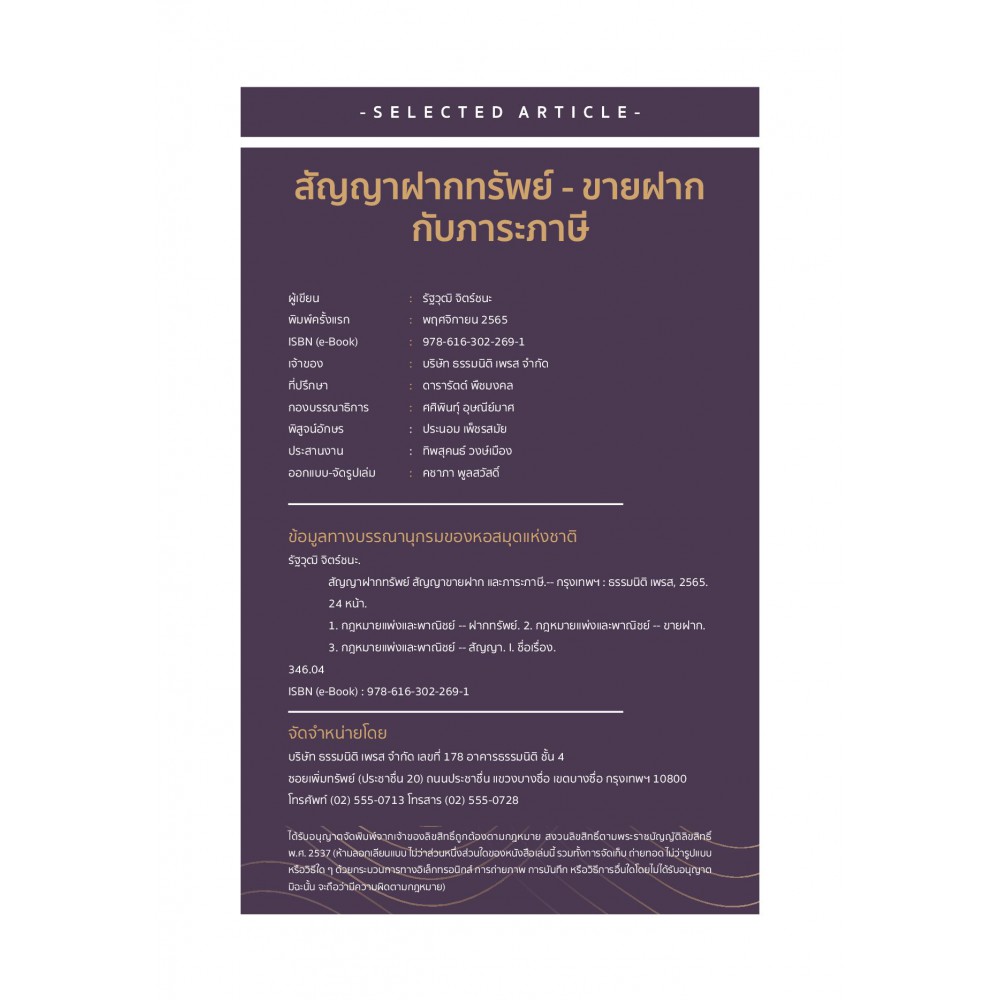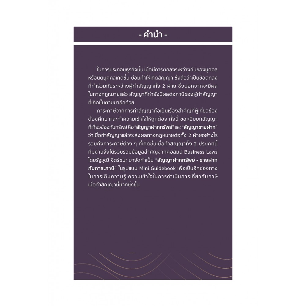 เมื่อมีการตกลงทำสัญญาระหว่างกัน โดยเฉพาะสัญญาที่เกี่ยวข้องกับทรัพย์คือ “สัญญาฝากทรัพย์” และ “สัญญาขายฝาก”นอกจากจะเกิดสิทธิและหน้าที่ระหว่างคู่สัญญาในทางกฎหมายแล้วภาระภาษีจากการทำสัญญา ซึ่งได้แก่ ภาษีเงินได้นิติบุคคลภาษีเงินได้บุคคลธรรมดา ภาษีเงินได้หัก ณ ที่จ่าย ภาษีมูลค่าเพิ่ม อากรแสตมป์ซึ่งในเล่มนี้ได้ยกกรณีที่เกิดขึ้นจริงให้ศึกษาและทำความเข้าใจให้ถูกต้องตามกฎหมายกรณีฝากทรัพย์ ผู้รับฝากต้องคืนดอกผลอันเกิดแต่ทรัพย์ที่ฝากแก่ผู้ฝากเช่น ฝากสุนัขแล้วสุนัขที่รับฝากคลอดลูกต้องคืนทั้งแม่และลูกสุนัขกรณีขายฝาก ผู้ขายฝากมีสิทธิไถ่ถอนหรือซื้อทรัพย์สินคืนหรือไม่ก็ได้ ฯลฯรวมถึงแนะนำภาระภาษีเมื่อมีการตกลงทำสัญญาทั้ง 2ประเภทนี้ว่าจัดเป็นเงินได้ประเภทใด นำมาหักเป็นรายจ่ายได้หรือไม่ต้องเสียภาษีตัวใดบ้าง เพื่อเป็นแนวทางในการนำไปปฏิบัติได้อย่างถูกต้อง