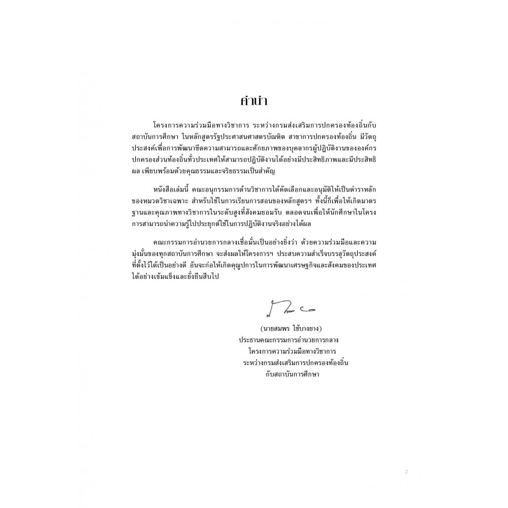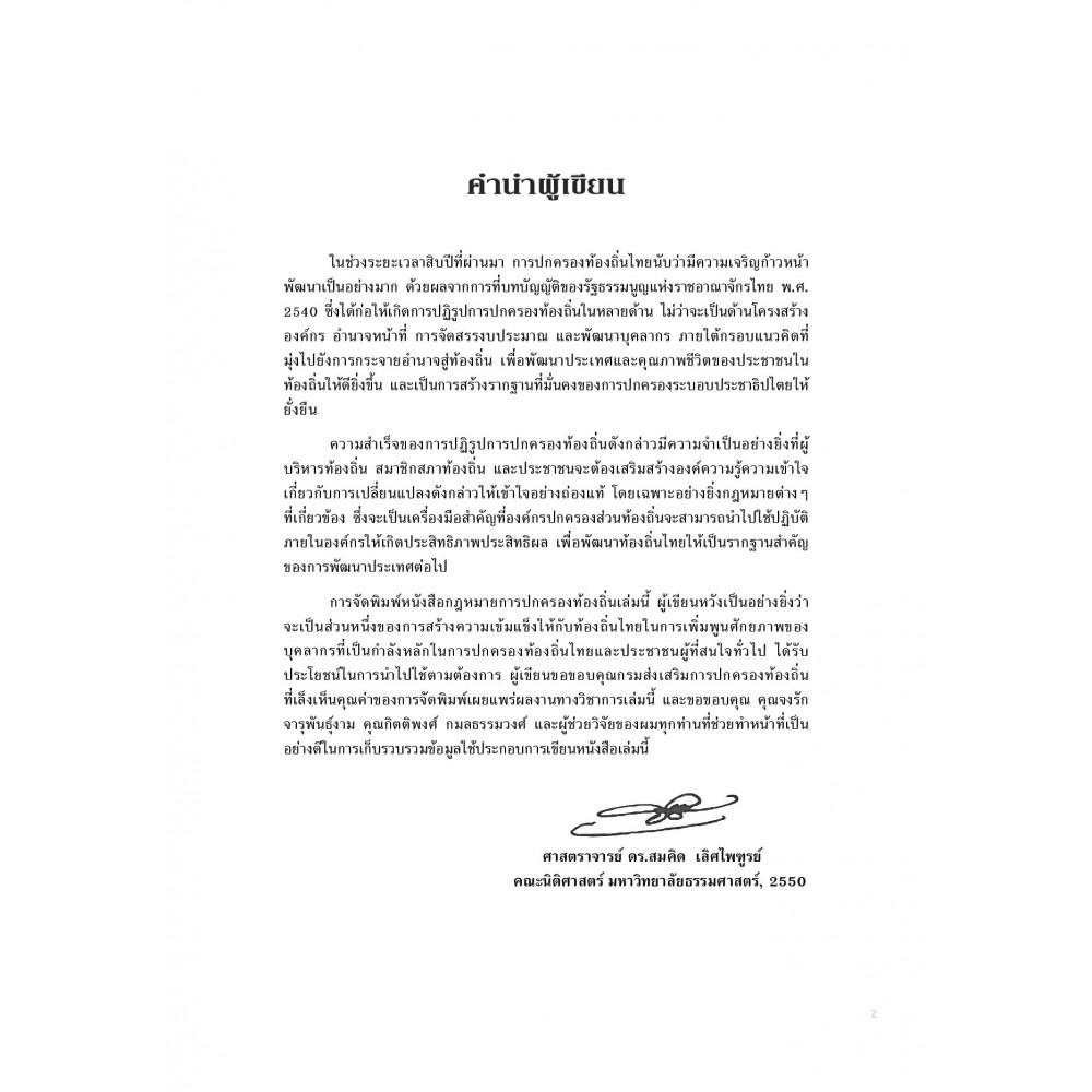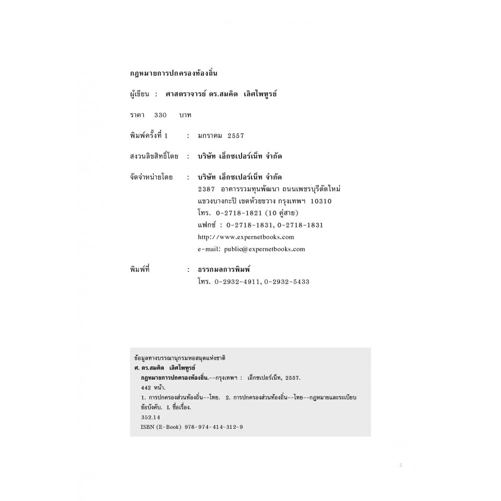 หนังสือ “กฎหมายการปกครองท้องถิ่น” เล่มนี้ เป็นเอกสารตำราหลักสำหรับใช้ ประกอบการเรียนการสอนในวิชา “กฎหมายสำหรับการปกครองส่วนท้องถิ่น (Law for Local Government)” ของหลักสูตรรัฐประศาสนศาสตรบัณฑิต สาขาการปกครองท้องถิ่น ซึ่งเป็น โครงการความร่วมมือทางวิชาการ ระหว่างกรมส่งเสริมการปกครองท้องถิ่นกับสถาบันการศึกษา “กฎหมายการปกครองท้องถิ่น” เป็นความรู้ที่ทรงคุณค่าอย่างยิ่งสำหรับองค์กร ปกครองส่วนท้องถิ่น ข้าราชการ และผู้ปฏิบัติงาน รวมทั้งส่วนราชการทั้งหลายที่ต้องมีหน้าที่ เกี่ยวข้องกับองค์กรปกครองส่วนท้องถิ่น ในการที่จะเรียนรู้หลักการและสาระสำคัญทางกฎหมาย ตลอดจนหลักเกณฑ์ทั่วไปสำหรับการปกครองท้องถิ่นของประเทศไทย อีกทั้งยังเหมาะสมที่จะมีไว้ ใช้ศึกษา ค้นคว้า อ้างอิง เพื่อประกอบการปฏิบัติหน้าที่ได้อย่างถูกต้องและมีประสิทธิผลยิ่งขึ้น สาระสำคัญในหนังสือเล่มนี้ประกอบด้วย หลักการจัดระเบียบราชการบริหาร : พื้นฐาน ของการปกครองท้องถิ่น ที่มาของกฎหมายปกครองท้องถิ่น วิวัฒนาการ และระบบกฎหมายการ ปกครองท้องถิ่นในประเทศไทย สาระสำคัญทางกฎหมายของการปกครองท้องถิ่นตามหลักการ กระจายอำนาจ เครื่องมือในการจัดทำบริการสาธารณะขององค์กรปกครองส่วนท้องถิ่น และ ลักษณะของการกระทำขององค์กรปกครองส่วนท้องถิ่น