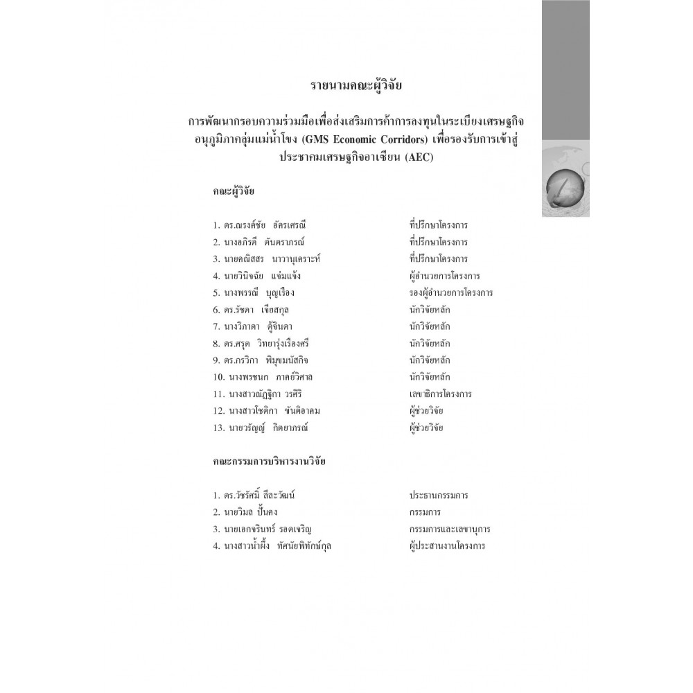 การพัฒนากรอบความร่วมมือเพื่อส่งเสริมการค้าและการลงทุนในระเบียงเศรษฐกิจอนุภูมิภาคลุ่มน้ำโขง (GMS Economic Corridors) เพื่อรองรับการเข้าสู่ประชาคมเศรษฐกิจอาเซียน (AEC)