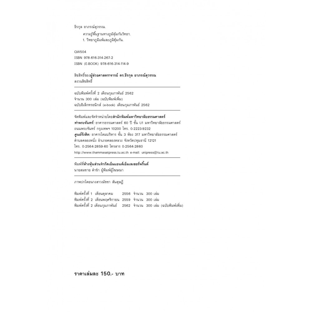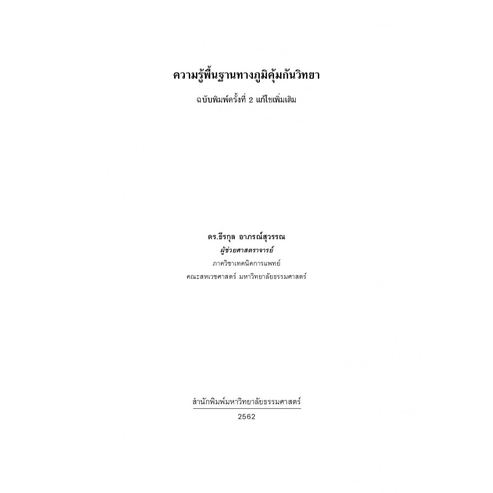 ความรู้พื้นฐานทางภูมิคุ้มกันวิทยาเล่มนี้ได้รวบรวมและเรียบเรียงเนื้อหาเกี่ยวกับการทํางานของระบบภูมิคุ้มกันของร่างกายในส่วนที่เกี่ยวกับเซลล์และอวัยวะที่เกี่ยวข้องกับระบบภูมิคุ้มกัน อธิบายรายละเอียด เกี่ยวกับกลไกการป้องกันร่างกายจากเชื้อโรคโดยระบบภูมิคุ้มกันชนิด innate immunity ที่ได้รับความสนใจ ศึกษาค้นคว้าองค์ความรู้เพิ่มเติมมากขึ้นอย่างมากในปัจจุบัน และได้รวบรวมเนื้อหาของแอนติเจนและ แอนติบอดี ในแง่มุมมองเกี่ยวกับความหมาย คุณสมบัติ และความหลากหลายของแอนติบอดี การผลิต แอนติบอดี และหลักการตรวจวิเคราะห์ทางภูมิคุ้มกันวิทยา หนังสือเล่มนี้ได้รวมเนื้อหาความน่าสนใจของเรื่อง ที่เกี่ยวกับภูมิคุ้มกันด้วยรูปภาพประกอบชัดเจน เพื่อให้ผู้อ่านเข้าใจได้ง่าย อันจะเป็นประโยชน์แก่ผู้สนใจศึกษา และประกอบการเรียนการสอนวิชาภูมิคุ้มกันวิทยา ความรู้พื้นฐานทางภูมิคุ้มกันวิทยาสามารถนําไปประยุกต์ใช้ในการตรวจวิเคราะห์และทดสอบทางห้องปฏิบัติการชันสูตรในโรงพยาบาลต่างๆ และงานวิจัยต่างๆ ด้วย