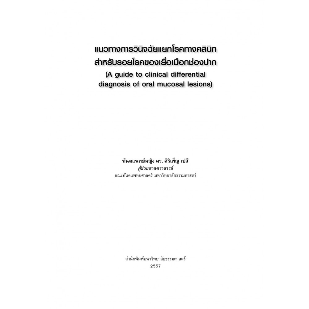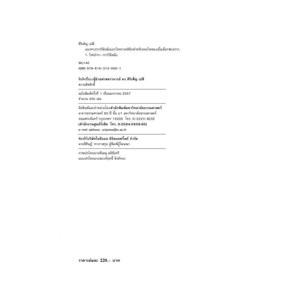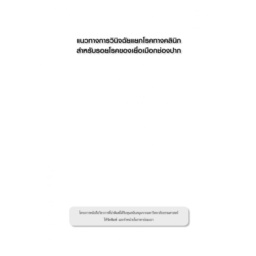 หนังสือเล่มนี้ ประกอบด้วยความรู้พื้นฐานเกี่ยวกับการตรวจวินิจฉัยโรค การชักประวัติ การตรวจทางคลินิกทั้งภายนอกและภายในช่องปาก ลักษณะของรอยโรค การตรวจเพิ่มเติมทางห้องปฏิบัติการและวิธีการใหม่ ีสำหรับการตรวจคัดกรองมะเร็งช่องปาก การวินิจฉัยแยกโรคของรอยโรคที่เกิดบนเยื่อเมือกช่องปากที่มีการเปลี่ยนแปลงของสี หรือหลุดออกเป็นแผล หรือมีการขยายขนาด โดยจะมีรายละเอียดของโรคต่าง ๆ ได้แก่ สาเหตุการเกิดโรค ลักษณะทางคลินิก การตรวจทางห้องปฏิบัติการที่จำเป็น การวินิจฉัยแยกโรค และการรักษา เพื่อใช้เป็นแนวทางสำหรับการวินิจฉัยแยกโรคทางคลินิก หนังสือเล่มนี้จึงเหมาะสำหรับนักศึกษาแพทย์และทันตแพทย์ทั่วไปเพื่อใช้เป็นแนวทางสำหรับการวินิจฉัยโรคเมื่อตรวจพบเยื่อเมือกช่องปากมีลักษณะที่ผิดปกติเกิดขึ้น