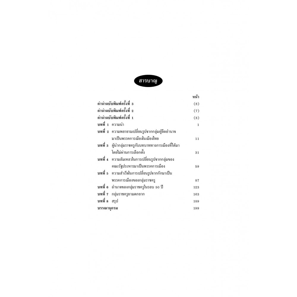 "กลุ่มราชครูในการเมืองไทย" เล่มนี้ นำเสนอเส้นทางการพัฒนากลุ่มบุคคลที่ได้โอกาสเข้ามาเล่นการเมือง ตั้งแต่การใช้กำลังเข้ามายึดอำนาจการปกครอง และต่อมาได้พยายามเปลี่ยนแปลงกายมาเป็นพรรคการเมือง เพื่อต่อสู้ในสนามเลือกตั้ง ที่มีทั้งความสำเร็จ และความล้มเหลว ผู้เขียนพาย้อนไปดูตั้งแต่การเริ่มต้นของกลุ่มตั้งแต่ครั้งที่ได้อำนาจรัฐมาโดยการรัฐประหาร แยกแยะประเด็นมองในแง่มุมต่างๆ เฉพาะที่เกี่ยวข้อง เพื่อมาดูถึงการสร้างตัวของกลุ่มและการเปลี่ยนรูปกับผลได้ของกลุ่ม ซึ่งเป็นปัจจัยหนึ่งที่ทำให้พรรคชาติไทยเป็นพรรคการเมืองที่มีความหมาย บทที่ 1 ความนำ บทที่ 2 ความพยายามเปลี่ยนรูปจากกลุ่มผู้ยึดอำนาจมาเป็นพรรคการเมืองในเมืองไทย บทที่ 3 ผู้นำกลุ่มราชครูกับบทบาททางการเมืองที่ได้มาโดยไม่ผ่านการเลือกตั้ง บทที่ 4 ความล้มเหลวในการเปลี่ยนรูปจากกลุ่มของคณะรัฐประหารมาเป็นพรรคการเมือง บทที่ 5 ความสำเร็จในการเปลี่ยนรูปจากก๊กมาเป็นพรรคการเมืองของกลุ่มราชครู บทที่ 6 อำนาจของกลุ่มราชครูในรอบ 50 ปี บทที่ 7 กลุ่มราชครูยามตกยาก บทที่ 8 สรุป