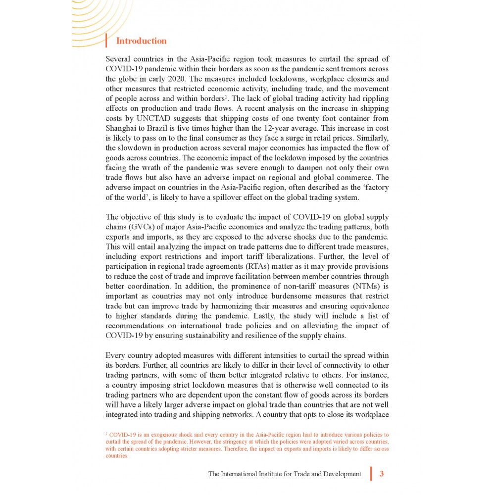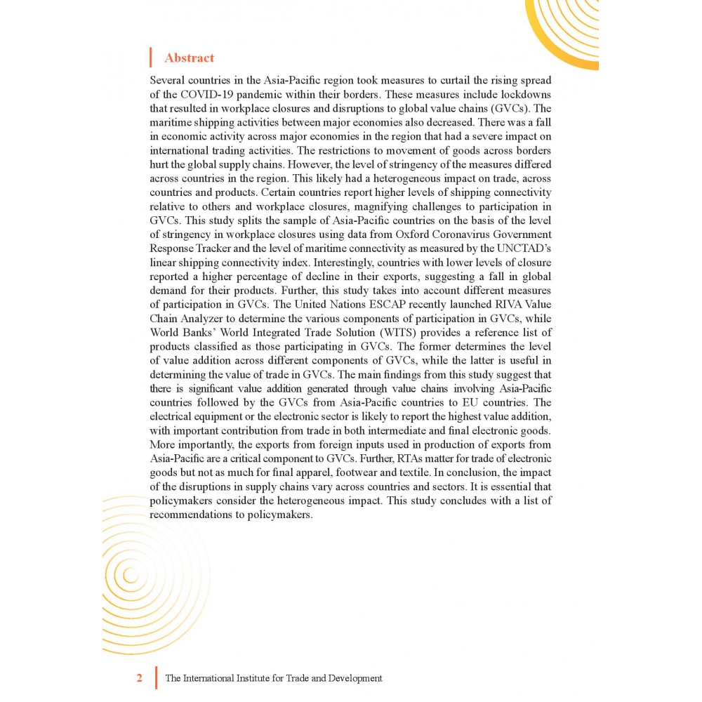 รายงาน “COVID-19 and Disruption in Supply Chains: Case study of Asia-Pacific Region” ได้ศึกษาผลกระทบของการแพร่ระบาดโควิด-19 ที่มีต่อการค้าระหว่างประเทศในภูมิภาคเอเชียแปซิฟิก ซึ่งถือเป็น Factory of the World เนื่องจากภูมิภาคเอเชียแปซิฟิกมีส่วนร่วมสูงในห่วงโซ่คุณค่าโลก การศึกษาพบว่า ผลกระทบของการแพร่ระบาดโควิด-19 มีความแตกต่างกันไปตามแต่ละประเทศ ประเภทอุตสาหกรรม และทิศทางการไหลของสินค้า นอกจากนี้ ประเทศในภูมิภาคเอเชียแปซิฟิกยังตอบสนองต่อการแพร่ระบาดโควิด-19 โดยการกำหนดมาตรการทางการค้าทั้งการนำเข้าและส่งออกที่แตกต่างกันไป ทั้งนี้ รายงานได้ชี้ให้เห็นว่า หน่วยงานภาครัฐจำเป็นต้องสนับสนุนการอำนวยความสะดวกทางการค้าให้มากขึ้น โดยคำนึงถึงประเภทของสินค้าและรูปแบบการไหลเวียนของสินค้าควบคู่ไปด้วย และหน่วยงานภาครัฐควรใช้ความตกลงทางการค้าภายในภูมิภาค (RTAs) และนอกภูมิภาค (FTAs) ในการเจรจาเพื่อเพิ่มการอำนวยความสะดวกทางการค้าในสินค้าที่ไหลเวียนผ่านชายแดนในปริมาณสูง