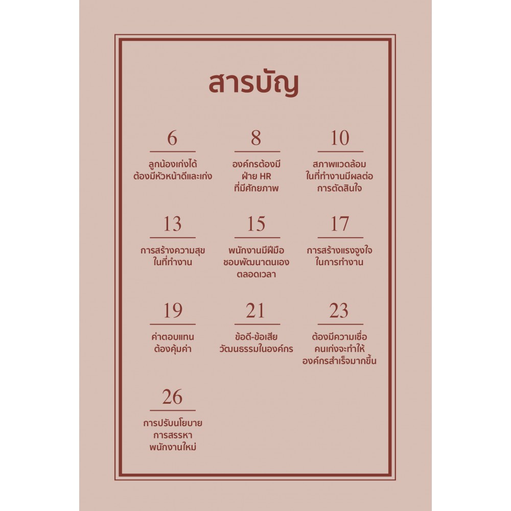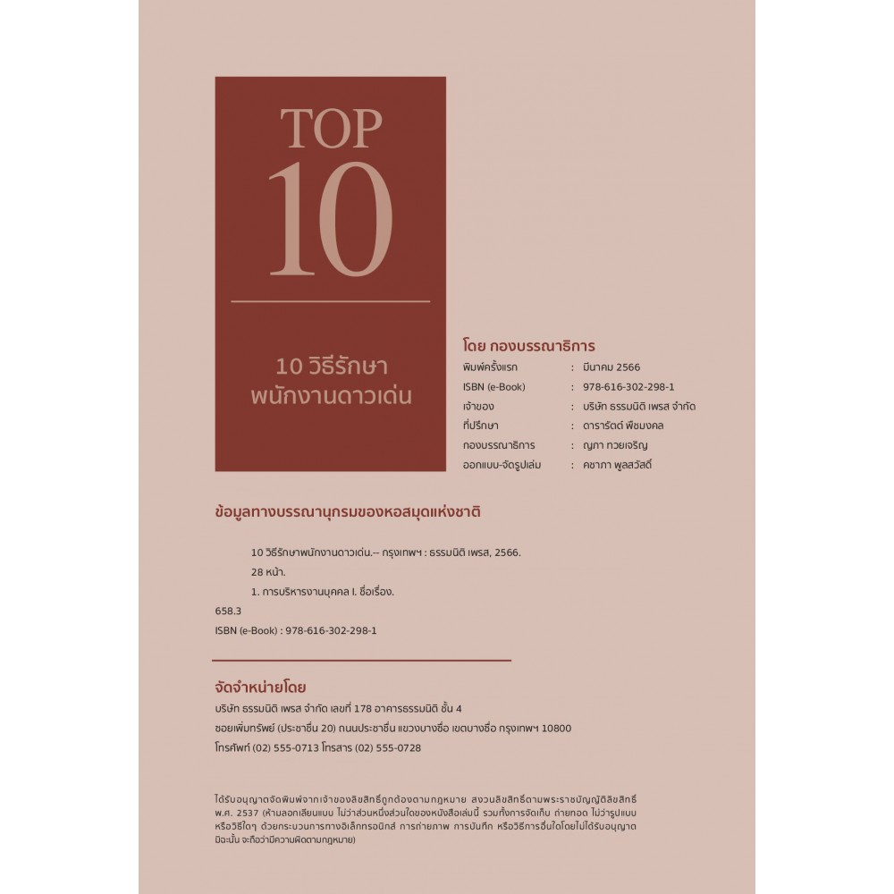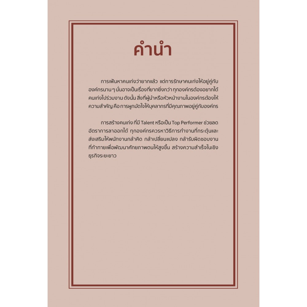 สิ่งที่ผู้นำหรือหัวหน้างานในองค์กรต้องให้ความสำคัญ คือ การผูกมัดใจให้บุคลากรที่มีคุณภาพอยู่คู่กับองค์กร ดังนั้น การสร้างคนเก่ง ที่มี Talent หรือเป็น Top Performer ช่วยลดอัตราการลาออกได้หนังสือเล่มนี้ จึงรวบรวม 10 วิธีรักษาพนักงานดาวเด่นที่จะกระตุ้นและส่งเสริมให้พนักงานกล้าคิด กล้าเปลี่ยนแปลงกล้ารับผิดชอบงานที่ท้าทาย เพื่อพัฒนาศักยภาพตนให้สูงขึ้นสร้างความสำเร็จในเชิงธุรกิจระยะยาว