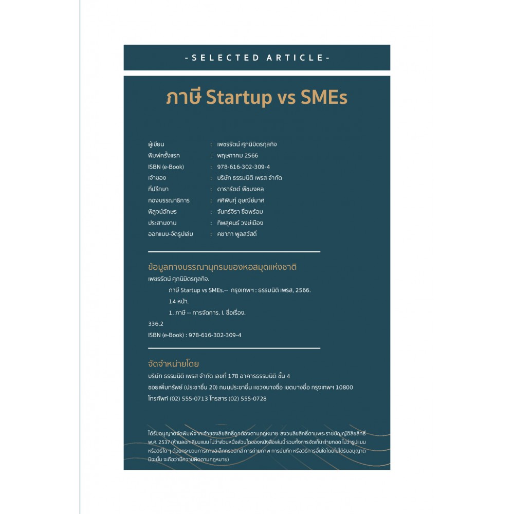 ข้อมูลที่รวบรวมในเล่มนี้จะช่วยให้เห็นถึงความแตกต่างของ Startup และ SMEs และเลือกก่อตั้งธุรกิจให้เหมาะสม พร้อมรับสิทธิประโยชน์ทางภาษีตามหลักเกณฑ์และเงื่อนไขที่กฎหมายกำหนดสำหรับธุรกิจของตนเอง ไม่ว่าจะเป็นสิทธิลดหรืองดภาษีเงินได้นิติบุคคล รวมถึงจัดการภาษีมูลค่าเพิ่มได้อย่างถูกต้อง หมดกังวลเรื่องปัญหาภาษี
