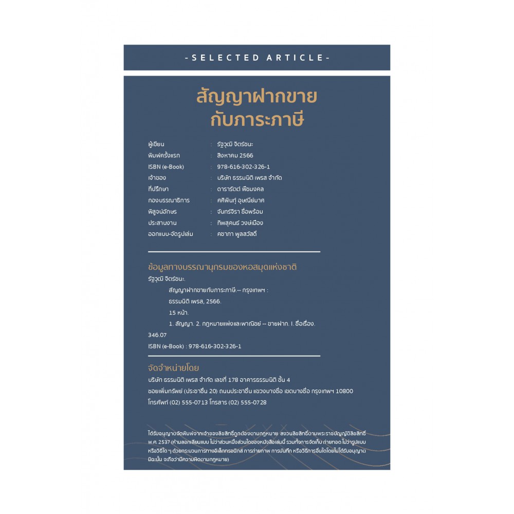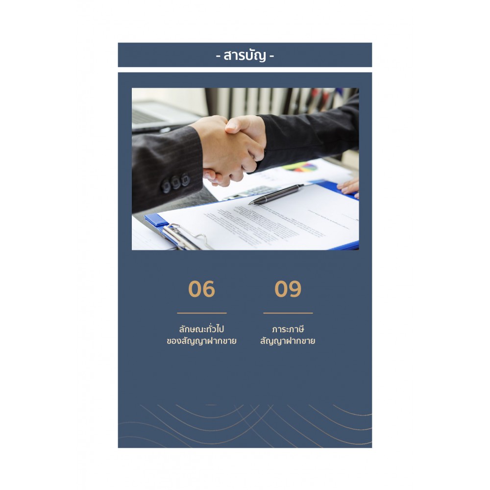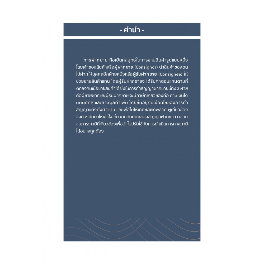 หนึ่งในกลยุทธ์การขายยอดนิยมก็คือ การฝากขาย ที่ต้องทำสัญญาฝากขายให้รัดกุม เมื่อมีรายได้ย่อมมีภาระภาษีตามมา ซึ่งในการทำสัญญาฝากขายนั้นจะมีภาษีที่เกี่ยวข้องอยู่ 2 ประเภท คือ ภาษีเงินได้นิติบุคคลและภาษีมูลค่าเพิ่ม โดยมีรายละเอียดการคำนวณแตกต่างกันตามรูปแบบสัญญาแต่งตั้งตัวแทน หากบริษัทหรือห้างหุ้นส่วนนิติบุคคลโอนอสังหาริมทรัพย์โดยไม่มีค่าตอบแทนหรือมีค่าตอบแทนต่ำกว่าราคาตลาดโดยไม่มีเหตุอันสมควร อาจทำให้กิจการต้องเสียเบี้ยปรับและเงินเพิ่มตามประมวลรัษฎากรได้ “สัญญาฝากขายและภาระภาษี” เล่มนี้จะช่วยให้เข้าใจหลักเกณฑ์ของภาษีทั้ง 2 ประเภทในการฝากขายเป็นอย่างดี เพื่อให้ประโยชน์ในการบันทึกรายได้ในทางบัญชีและจัดการทางภาษีได้ถูกต้อง ไม่เกิดปัญหาตามมาในภายหลัง