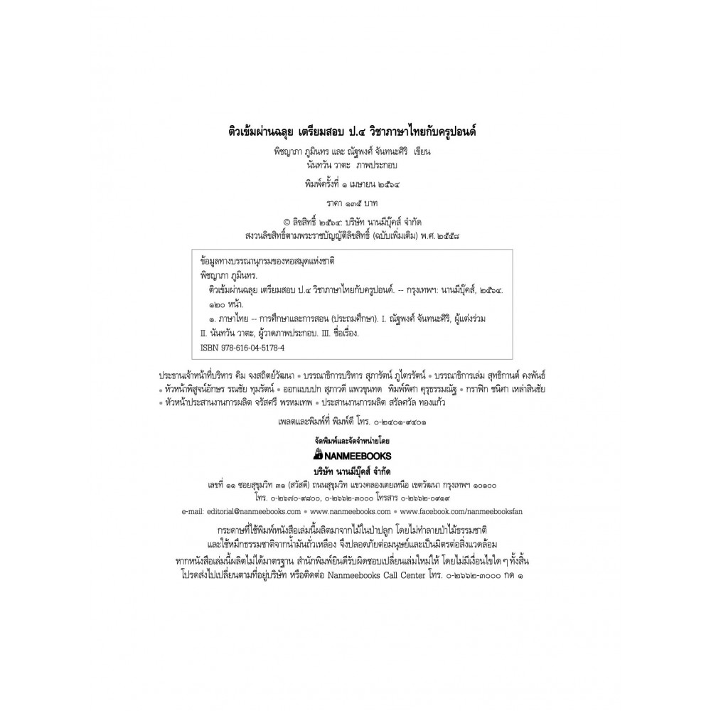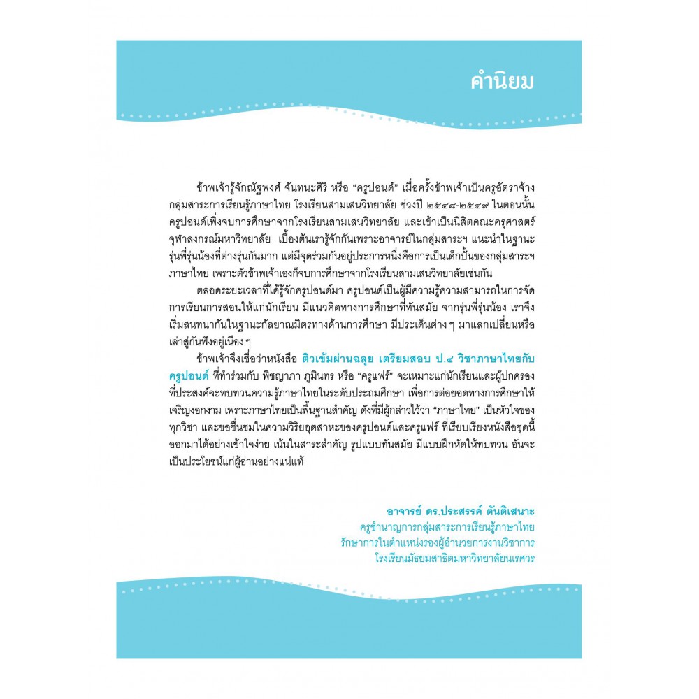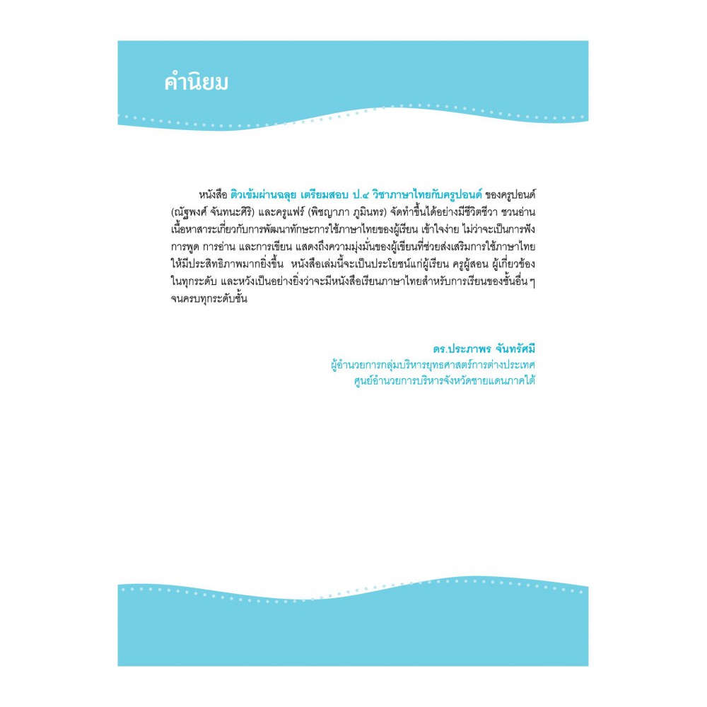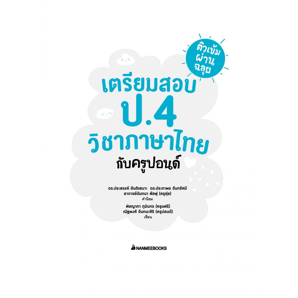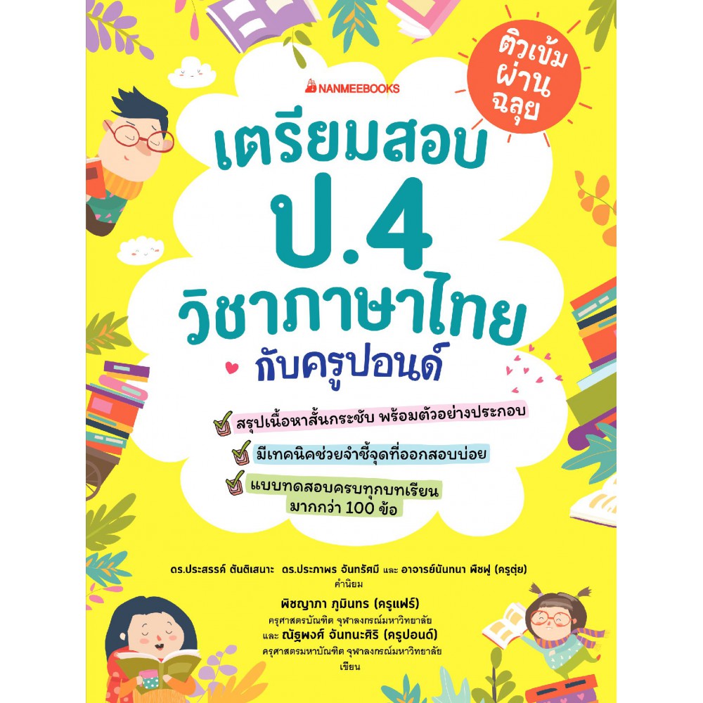 อีกไม่นานก็จะต้องเตรียมตัวสอบวิชาภาษาไทย ป.4 แล้ว มาเตรียมตัวสอบด้วยหนังสือ ติวเข้มผ่านฉลุย เตรียมสอบ ป.4 วิชาภาษาไทยกับครูปอนด์ กันเถอะ เนื้อหากระชับพร้อมตัวอย่างประกอบ เผยเทคนิคน่ารู้และข้อควรจำที่ทำให้ข้อสอบง่ายขึ้น เหมาะสำหรับอ่านทบทวนบทเรียนและเตรียมตัวสอบ แถมด้วยข้อสังเกต เทคนิคท่องจำ และคำถามที่ออกสอบบ่อยมากกว่า 100 ข้อ ถ่ายทอดโดยติวเตอร์ภาษาไทยชื่อดังระดับประเทศ!