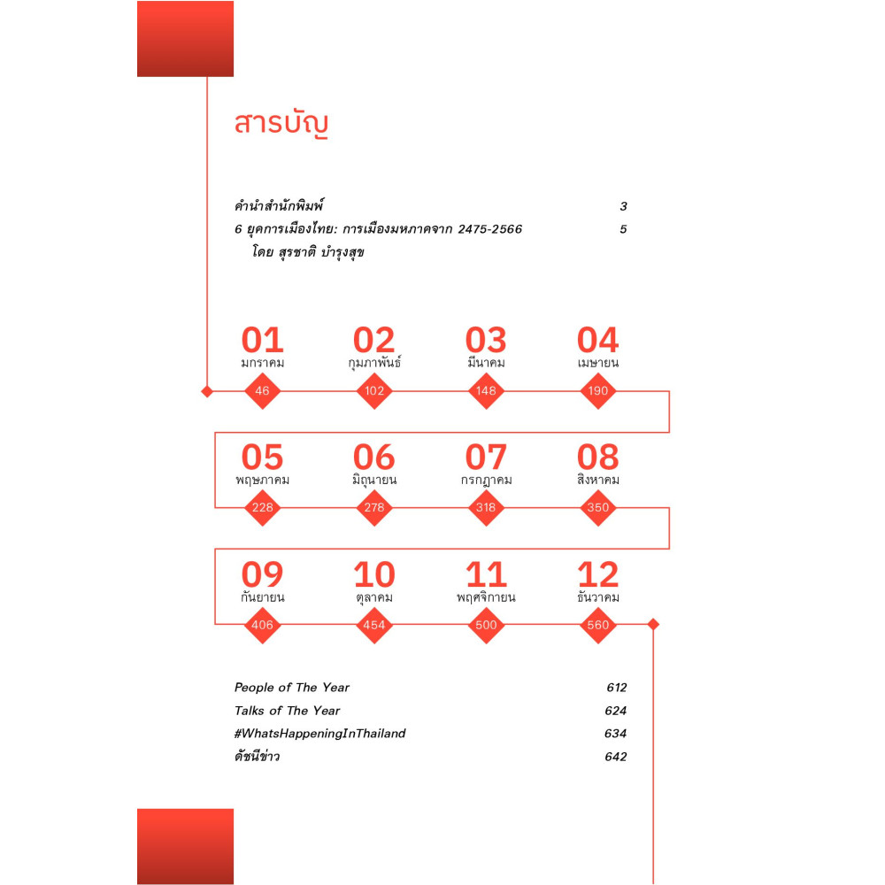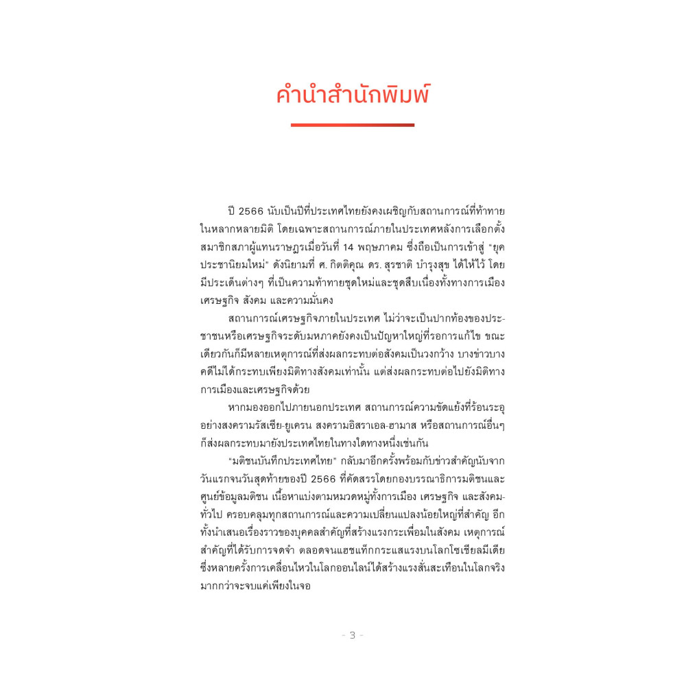 การกลับมาอีกครั้งของหนังสือรวบรวมเหตุบ้านการเมืองที่ส่งผลกระทบต่อสังคม และบันทึกภาพความทรงจำทุกเหตุการณ์ที่สำคัญที่ถือได้ว่าคือ จุดเปลี่ยน ของประเทศไทยในปี 2566 เพื่อให้นักอ่านทุกคนได้ทบทวนเรื่องราวที่ผ่านมาและพร้อมที่จะก้าวเผชิญต่อเหตุการณ์ในปีข้างหน้า . ภายในเล่มประกอบด้วยข่าวตลอดทั้งปี 3 หมวด ได้แก่ การเมือง เศรษฐกิจ และสังคม-ทั่วไป พร้อมบทความพิเศษโดย ศ.กิตติคุณ ดร. สุรชาติ บำรุงสุข ที่จะฉายภาพเหตุการณ์ทางการเมืองไทยนับจากปี 2575-2566 ปิดท้ายด้วยการจัดอันดับแห่งปี ไม่ว่าจะเป็นบุคคลสำคัญ ข่าวสำคัญ รวมถึงแฮชแท็กที่เป็นกระแสบนโลกโซเชียลมีเดีย
