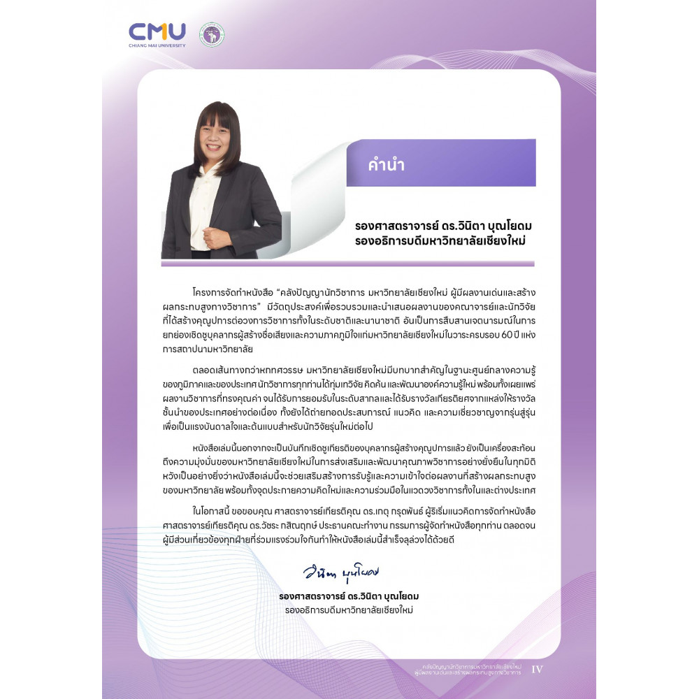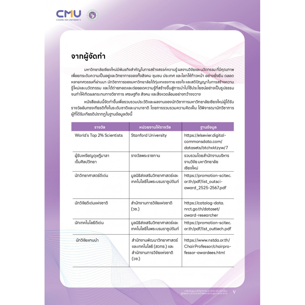 หนังสือเล่มนี้จัดทำขึ้นเพื่อรวบรวมประวัติและผลงานของนักวิชาการมหาวิทยาลัยเชียงใหม่ผู้ได้รับรางวัลอันทรงเกียรติทั้งในระดับชาติและนานาชาติ จำนวน 88 ท่าน ศาสตราจารย์เกียรติคุณ ดร. อานันท์ กาญจนพันธ์ ได้กรุณาสังเคราะห์ประเด็นงานวิจัยของนักวิชาการดังกล่าวได้เป็นประเด็นวิจัยร่วม 8 ประเด็น ได้แก่ คือ 1. ด้านวิทยาศาสตร์สุขภาพและนวัตกรรมทางการแพทย์ 2. ด้านเกษตรยั่งยืนและความมั่นคงทางเศรษฐกิจ 3.ด้านปัญหาสิ่งแวดล้อมและโรคระบาด 4. ด้านพลังงานทางเลือกเพื่อลดสภาวะโรคร้อน 5. การเกลุ่มเปราะบางและการมีส่วนร่วมทางสังคมการเมือง 6. ด้านวัฒนธรรมและประวัติศาสตร์ท้องถิ่น 7. ด้านการพัฒนาเทคโนโลยีและงชีวิตสมัยใหม่ 8. การสังเคราะห์ความรู้ใหม่เกี่ยวกับโลกสีเขียวและความยั่งยืนในทุกมิติ ผู้จัดทำฯ หวังเป็นอย่างยิ่งว่าหนังสือที่ปรากฎนี้จะเป็นประโยชน์ตามวัตถุประสงค์ที่ตั้งไว้ คือ • ถ่ายทอดและสร้างแรงบันดาลใจให้แก่นักวิจัยรุ่นใหม่และผู้สนใจในวิชาการ • แสดงให้เห็นถึงผลกระทบเชิงบวกของงานวิจัยที่สะท้อนถึงพลังของความรู้และนวัตกรรม • เป็นฐานข้อมูลเชิงกลยุทธ์ที่ผู้บริหารมหาวิทยาลัยสามารถนำไปใช้ประกอบการกำหนดทิศทางและวางแผนวิจัยในอนาคต