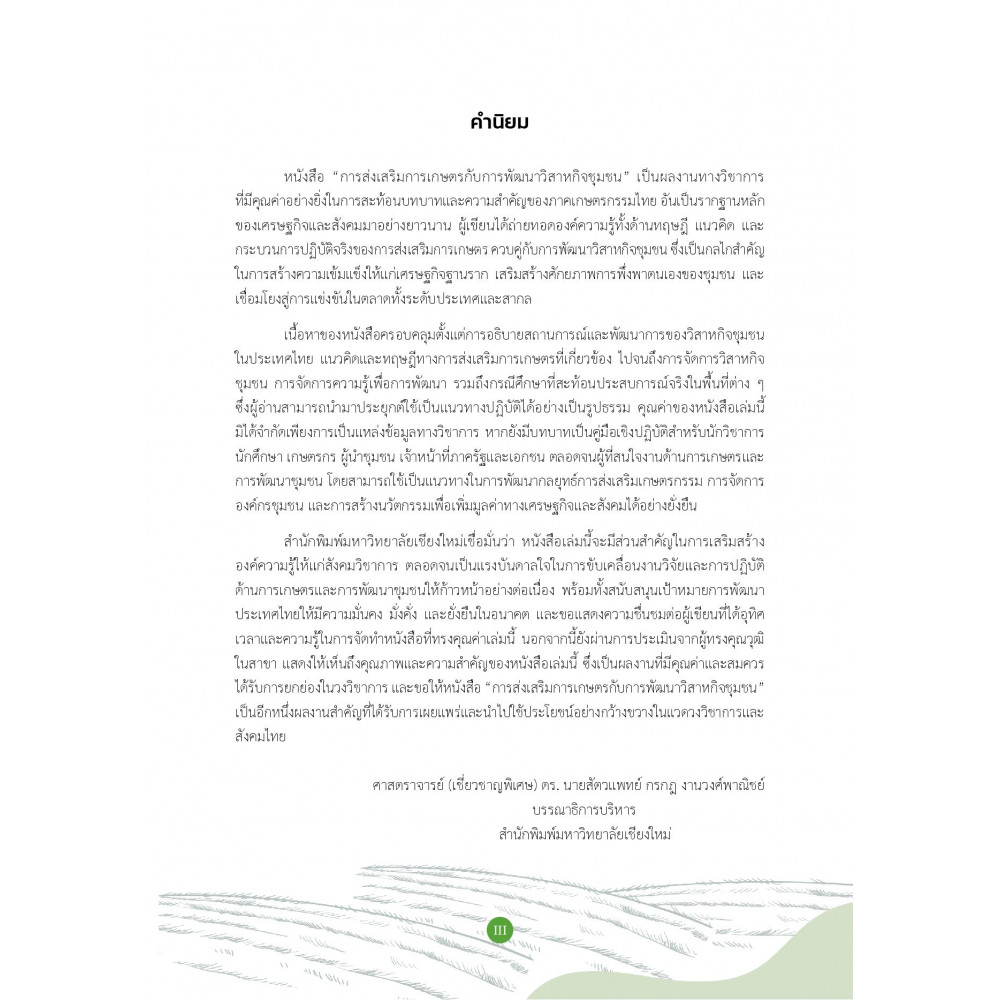 หนังสือเล่มนี้เป็นแหล่งอ้างอิงที่สำคัญสำหรับการทำความเข้าใจความเชื่อมโยงระหว่างการเกษตรการพัฒนาชุมชน และการสร้างความเข้มแข็งทางเศรษฐกิจในระดับฐานรากเพื่อนำไปสู่การพัฒนาที่ยั่งยืนของสังคมไทย
