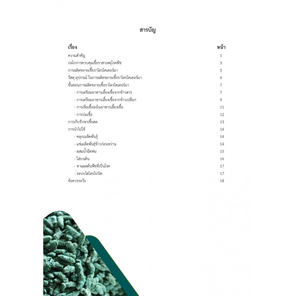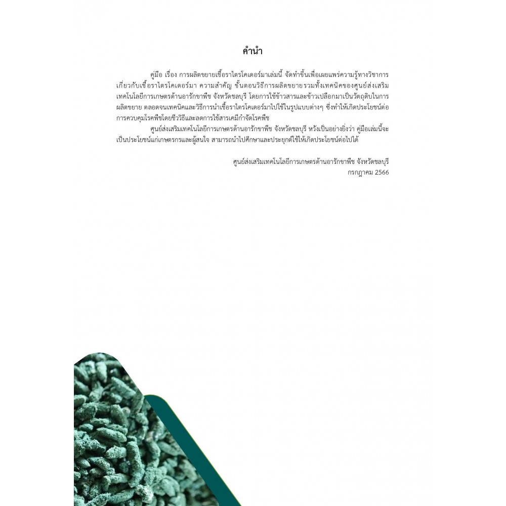 คู่มือ เรื่อง การผลิตขยายเชื้อราไตรโคเดอร์มาเล่มนี้ จัดทำขึ้นเพื่อเผยแพร่ความรู้ทางวิชาการ เกี่ยวกับเชื้อราไตรโคเดอร์มา ความสำคัญ ขั้นตอนวิธีการผลิตขยายรวมทั้งเทคนิคของศูนย์ส่งเสริม เทคโนโลยีการเกษตรด้านอารักขาพืช จังหวัดชลบุรี โดยการใช้ข้าวสารและข้าวเปลือกมาเป็นวัตถุดิบในการ ผลิตขยาย ตลอดจนเทคนิคและวิธีการนำเชื้อราไตรโคเดอร์มาไปใช้ในรูปแบบต่างๆ ซึ่งทำให้เกิดประโยชน์ต่อ การควบคุมโรคพืชโดยชีววิธีและลดการใช้สารเคมีกำจัดโรคพืช ศูนย์ส่งเสริมเทคโนโลยีการเกษตรด้านอารักขาพืช จังหวัดชลบุรี หวังเป็นอย่างยิ่งว่า คู่มือเล่มนี้จะ เป็นประโยชน์แก่เกษตรกรและผู้สนใจ สามารถนำไปศึกษาและประยุกต์ใช้ให้เกิดประโยชน์ต่อไปได้