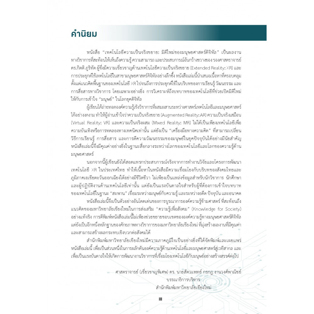 นำเสนอการบูรณาการองค์ความรู้ด้านเทคโนโลยีความเป็นจริงขยาย ครอบคลุมทั้งความเป็นจริงเสริมความเป็นจริงเสมือนและความเป็นจริงผสมเข้ากับศาสตร์ด้านมนุษยศาสตร์และวัฒนธรรมเพื่อเปิดมิติใหม่ของ "มนุษยศาสตร์ดิจิทัล"ที่เชื่อมโยงการเรียนรู้เชิงทฤษฎีกับประสบการณ์เชิงปฏิสัมพันธ์ในโลกเสมือนจริงอย่างมีความหมายเนื้อหาประกอบด้วยแนวคิดพื้นฐาน ทฤษฎีสำคัญ รวมถึงกรณีศึกษาที่ถ่ายทอดกระบวนการประยุกต์ใช้เทคโนโลยีอย่างเป็นรูปธรรม