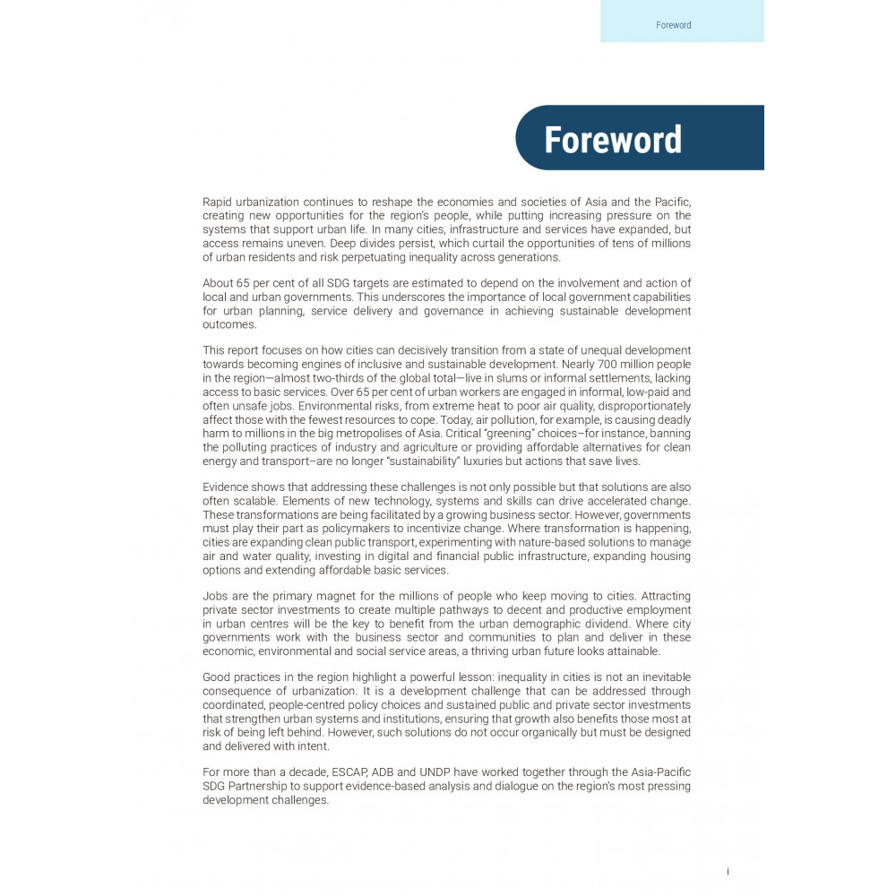Rapid urbanization continues to reshape the economies and societies of Asia and the Paci c, creating new opportunities for the region’s people, while putting increasing pressure on the systems that support urban life. In many cities, infrastructure and services have expanded, but access remains uneven. Deep divides persist, which curtail the opportunities of tens of millions of urban residents and risk perpetuating inequality across generations.