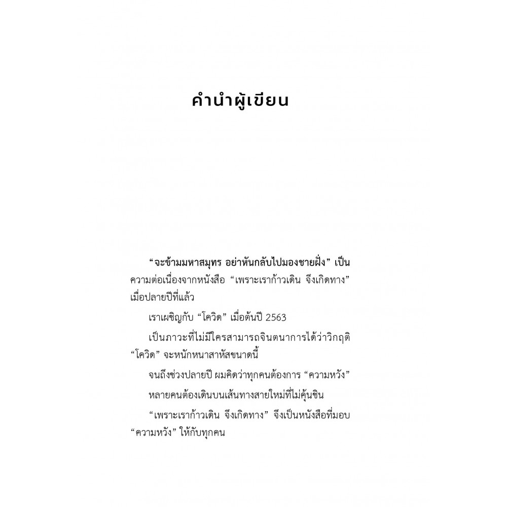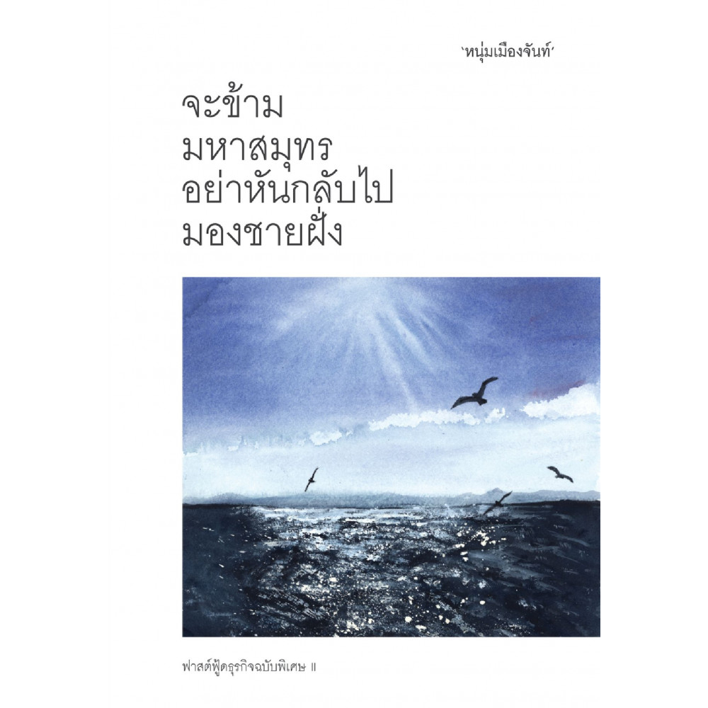 เคยสงสัยไหมว่าตอนที่ "โคลัมบัส" ล่องเรือเพื่อค้นหาแผ่นดินใหม่ ช่วงเวลาที่อยู่ท่ามกลางคลื่นลมในมหาสมุทรที่เวิ้งว้างมายาวนาน อะไรทำให้เขาไม่หันหัวเรือกลับ แต่ยังเดินหน้าไปเรื่อยๆ คำตอบ คือ "ความเชื่อ" "เข็มทิศ" บอกทางให้เรือ แต่ "ความเชื่อ" จะพาเราไปถึงเป้าหมาย แต่ละคนมีขนาดของ "มหาสมุทร" ในใจไม่เท่ากัน บางคนกำลังเปลี่ยนแปลงชีวิตครั้งใหม่ บางคนเปลี่ยนงาน บางคนอกหักต้องการ "มูฟออน" ฯลฯ ทุกคนล้วนต้องการความกล้าในหัวใจ และ "กำลังใจ" จาก "ใครสักคน" "จะข้ามมหาสมุทร อย่าหันกลับไปมองชายฝั่ง" เป็นหนังสือแห่ง "ความหวัง" และเป็น "ใครสักคน" ที่คุณกำลังมองหา