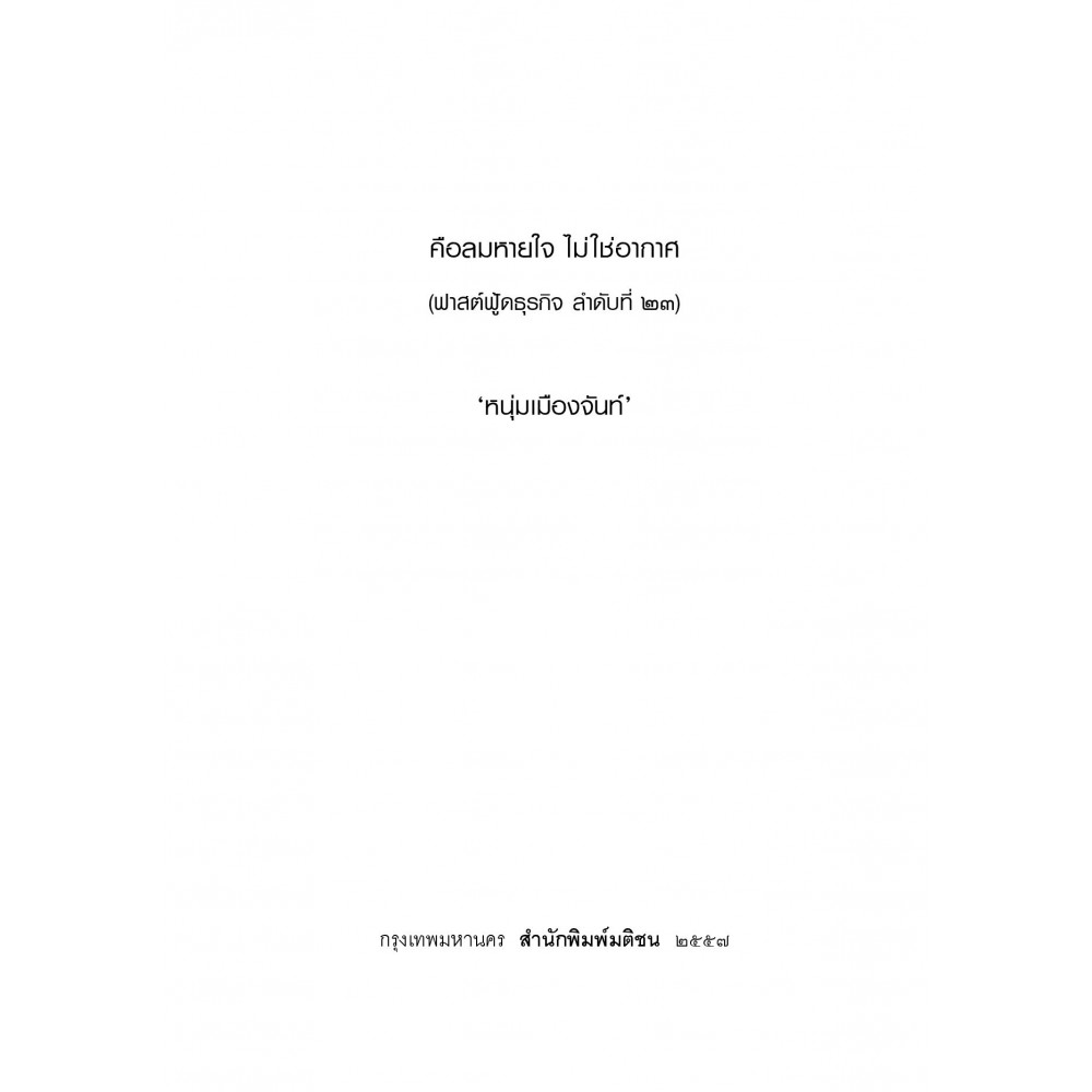 "คือลมหายใจ ไม่ใช่อากาศ" ฟาสต์ฟู้ดธุรกิจ ลำดับที่ ๒๓ เล่มนี้ ‘หนุ่มเมืองจันท์’ จะมาบอกเล่าเรื่องราวเกี่ยวกับความฝัน เสรีภาพ และมีอีกหนึ่งสิ่งพิเศษ นั่นก็คือ “ความรัก” อีกทั้งยังเสนอแง่มุมชีวิตที่เสริมสร้างแรงบันดาลใจ พร้อมชวนให้เราได้ตระหนักถึงสิ่งสำคัญที่เราควรทำ และควรค่าแก่การดูแล เมื่ออ่านหนังสือเล่มนี้จบเราอาจจะได้พบคำตอบ ว่าสิ่งไหนคือ “อากาศ” และสิ่งไหนคือ “ลมหายใจ” สิ่งใดที่เราควร “ปล่อยผ่านไป” และสิ่งใดที่เราควร “รักษาไว้ยิ่งชีพ”