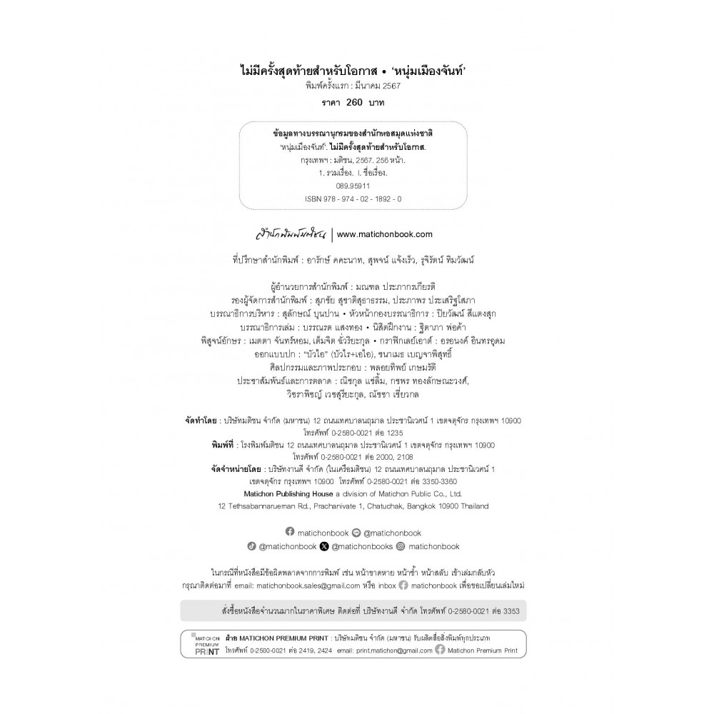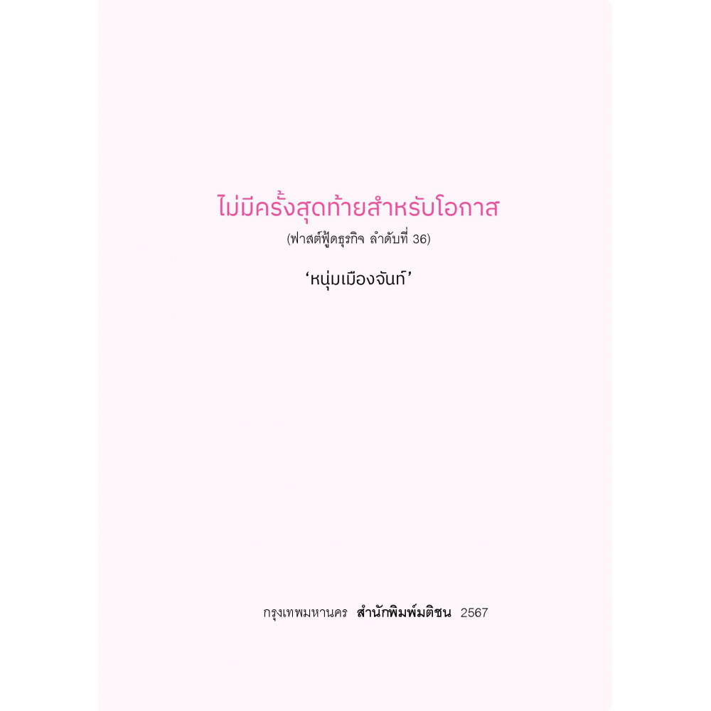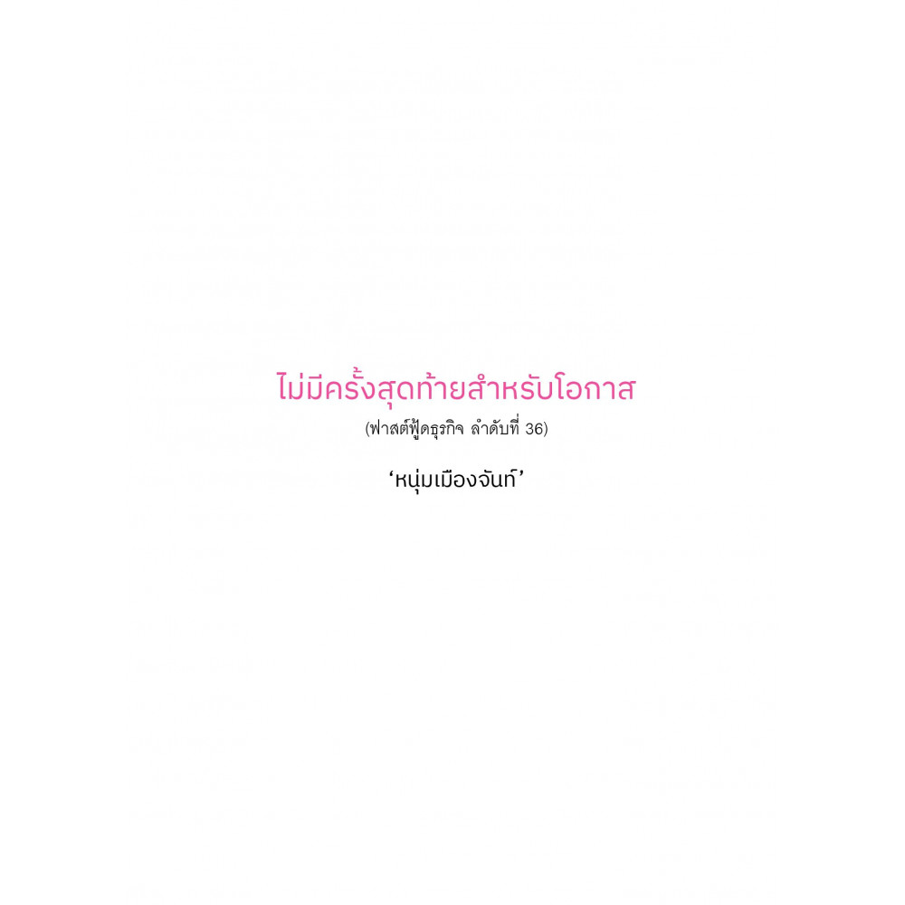 โอกาส” คำสั้นๆ ที่ใครหลายคนใฝ่ฝันว่าจะได้มันมาครอบครอง แต่ขณะเดียวกันก็มักกังวลว่า เมื่อ “โอกาส” มาถึง… เราจะไม่รู้ตัว คว้าไม่ทัน จนมันผ่านเลยไป แล้วเมื่อไหร่ที่ “โอกาส” แบบนี้จะเกิดขึ้นอีก เข้าใจคำว่า “โอกาส” ที่ไม่มีครั้งสุดท้าย ผ่านการรวบรวมเรื่องราวจริงผ่าน 28 บท ภายในเล่ม อาทิ ขอโทษและขอบคุณ, ไม่รู้ คือ “ความรู้”, ความเชื่อใจ, ความรักที่ยิ่งใหญ่ และ ไม่เคยมี “ครั้งสุดท้าย” สำหรับ “โอกาส” เป็นต้น