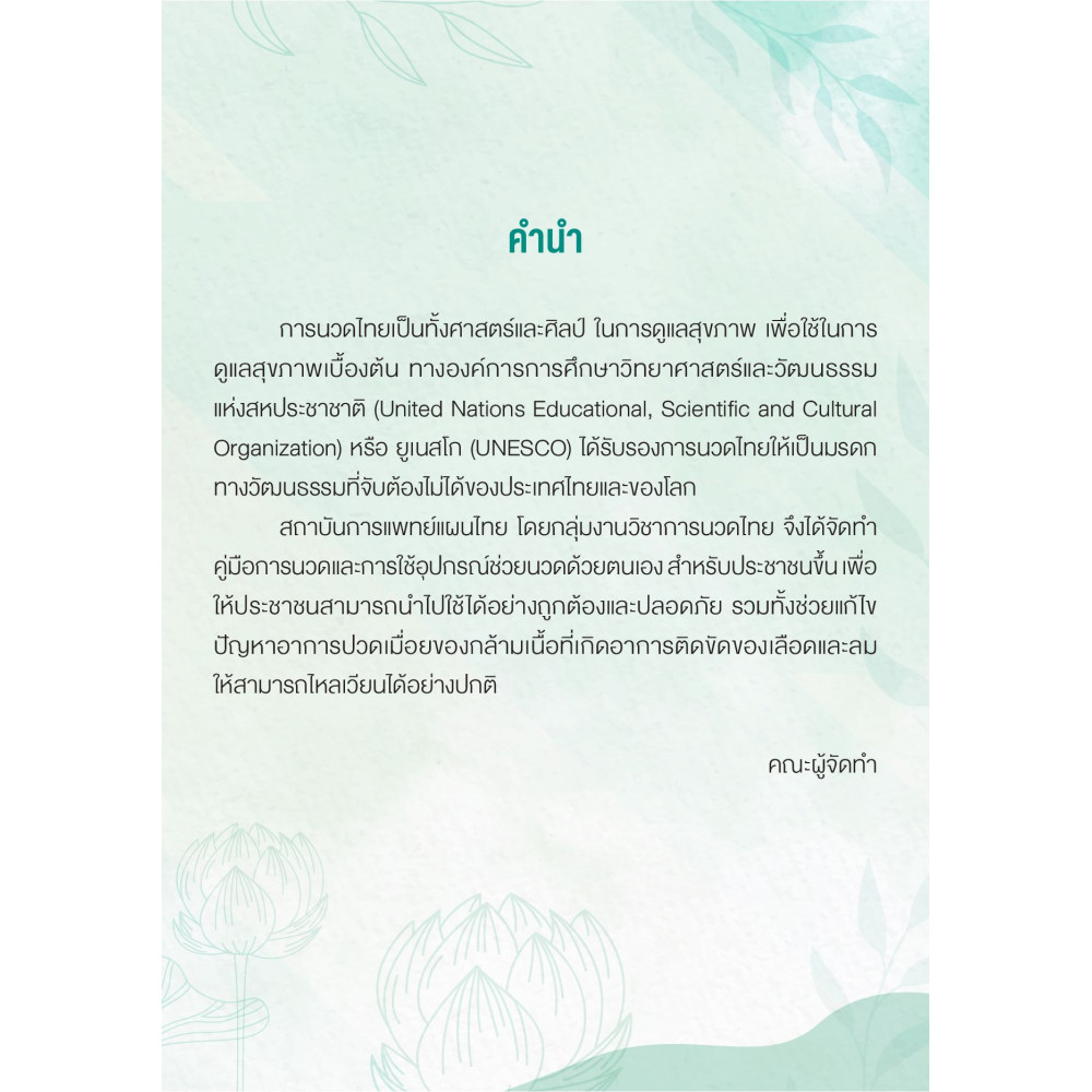 การมวดไทยเป็นทั้งศาสตร์และศิลป์ ในการดูแลสุขภาพ เพื่อใช้ในการ ดูแลสุขภาพเบื้องตัน ทางองค์การการศึกษาวิทยาศาสตร์และวัฒนธรรม แห่งสหประชาชาติ (United Nations Educational, Scientific and Cultural Organization) หรือ ยูเนสโก (UNESCO) ได้รับรองการนวดไทยให้เป็นมรดก ทางวัฒนธรรมที่จับต้องไม่ได้ของประเทศไทยและของโลก สถาบันการแพทย์เผนไทย โดยกลุ่มงานวิชาการนวดไทย จึงได้จัดทำ คู่มือการนวดและการใช้อุปกรณ์ช่วยนวดด้วยตนเอง สำหรับประชาชนขึ้น เพื่อ ให้ประชาชนสามารถนำไปใช้ได้อย่างถูกต้องและปลอดภัย รวมทั้งช่วยแก้ไข ปัญหาอาการปวดเมื่อยของกล้ามเนื้อที่เกิดอาการติดขัดของเลือดและลม ให้สามารถไหลเวียนได้อย่างปกติ