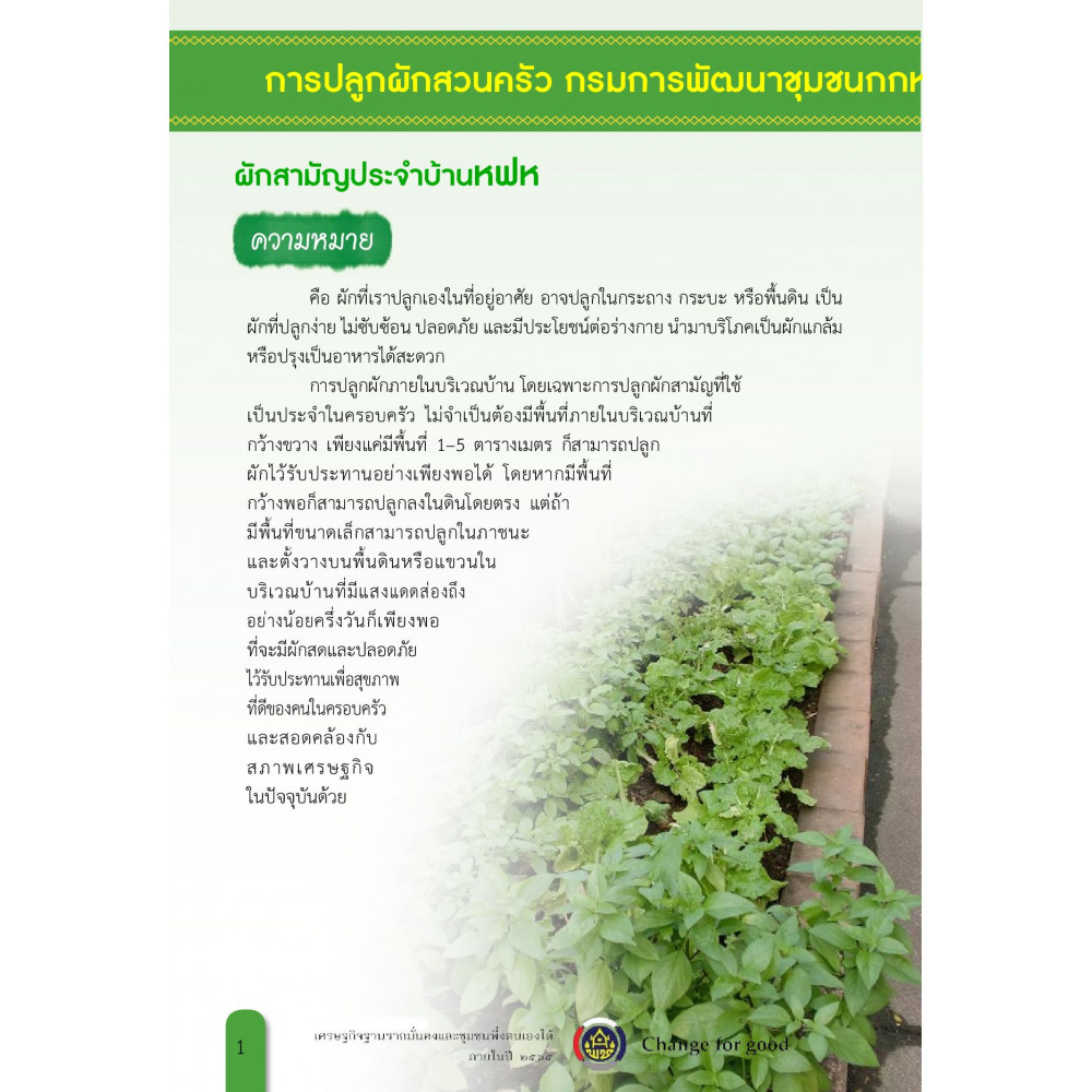 คือ ผักที่เราปลูกเองในที่อยู่อาศัย อาจปลูกในกระถาง กระบะ หรือพื้นดิน เป็น ผักที่ปลูกง่ายไม่ซับซ้อน ปลอดภัยและมีประโยชน์ต่อร่างกาย นำมาบริโภคเป็นผักแกล้ม หรือปรุงเป็นอาหารได้สะดวก การปลูกผักภายในบริเวณบ้าน โดยเฉพาะการปลูกผักสามัญที่ใช้ เป็นประจำในครอบครัว ไม่จำเป็นต้องมีพื้นที่ภายในบริเวณบ้านที่ กว้างขวาง เพียงแค่มีพื้นที่ 1–5 ตารางเมตร ก็สามารถปลูก ผักไว้รับประทานอย่างเพียงพอได้ โดยหากมีพื้นที่ กว้างพอก็สามารถปลูกลงในดินโดยตรง แต่ถ้า มีพื้นที่ขนาดเล็กสามารถปลูกในภาชนะ และตั้งวางบนพื้นดินหรือแขวนใน บริเวณบ้านที่มีแสงแดดส ่องถึง อย่างน้อยครึ่งวันก็เพียงพอ ที่จะมีผักสดและปลอดภัย ไว้รับประทานเพื่อสุขภาพ ที่ดีของคนในครอบครัว และสอดคล้องกับ สภาพเศรษฐกิจ ในปัจจุบันด้วย