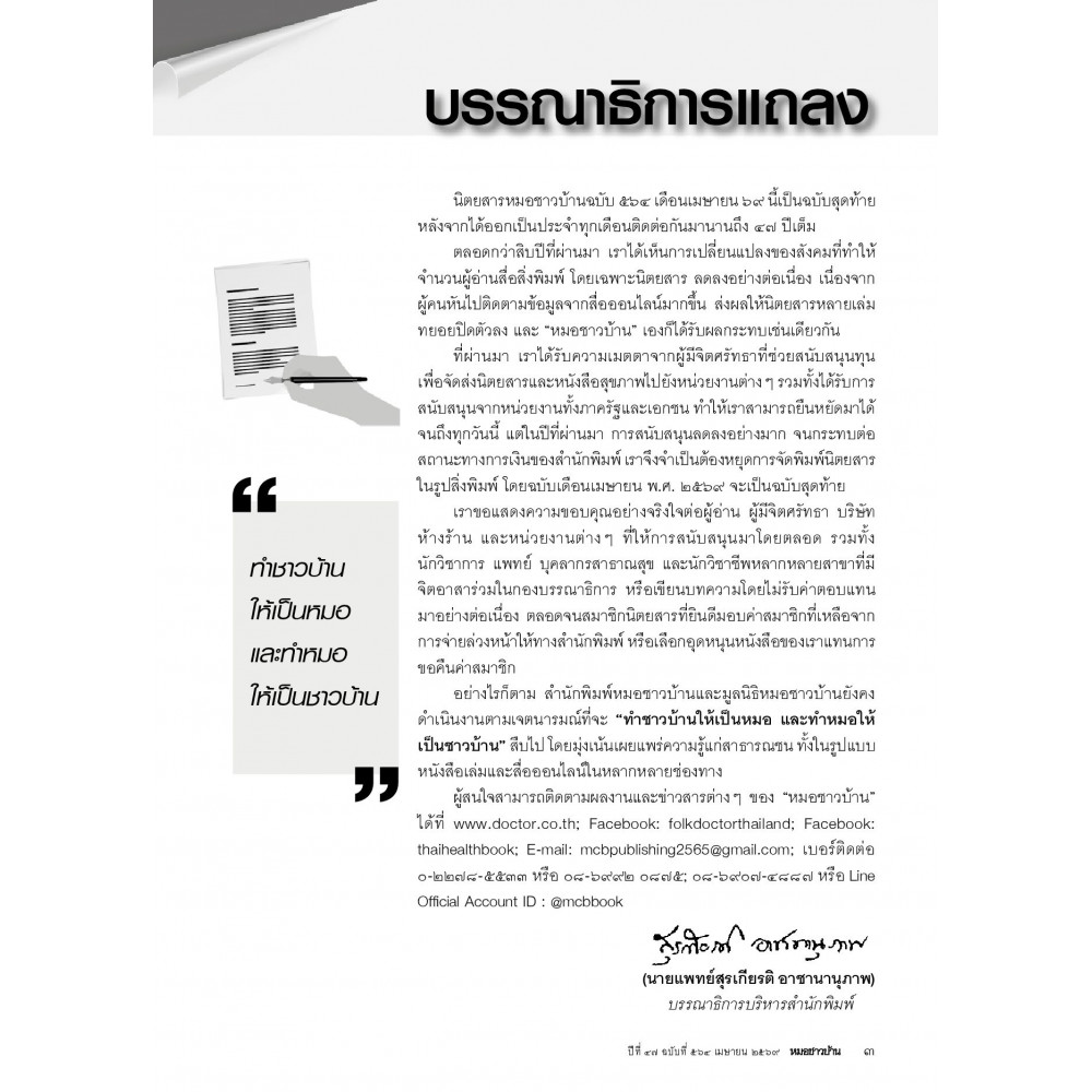 หมอชาวบ้าน เป็น e-magazine สุขภาพประจำทุกครอบครัว การดูแลสุขภาพด้วยตนเอง และสำหรับทุกเพศทุกวัยที่รักสุขภาพ