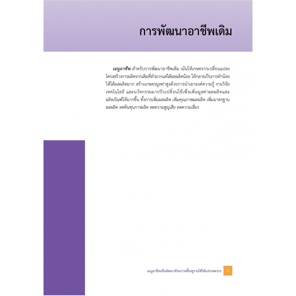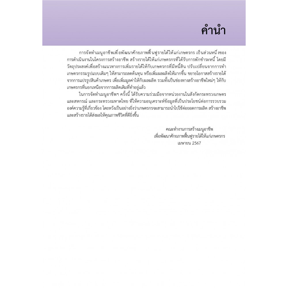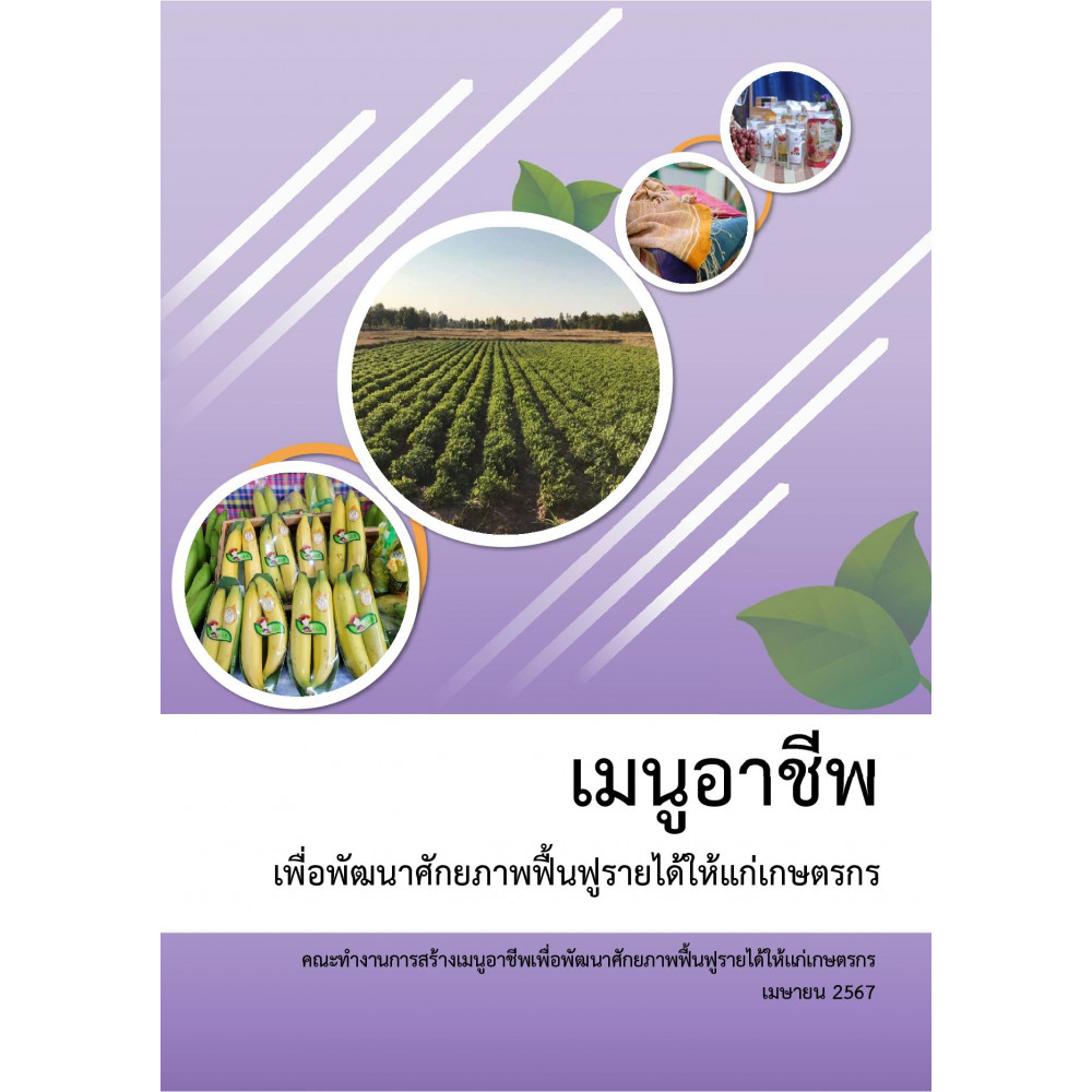 การจัดทําเมนูอาชีพเพื่อพัฒนาศักยภาพฟื้นฟูรายได้ให้แก่เกษตรกร เป็นส่วนหนึ่งของ การดําเนินงานในโครงการสร้างอาชีพ สร้างรายได้ให้แก่เกษตรกรที่ได้รับการพักชําระหนี้ โดยมี วัตถุประสงค์เพื่อสร้างแนวทางการเพิ่มรายได้ให้กับเกษตรกรที่มีหนี้สิน ปรับเปลี่ยนจากการทํา เกษตรกรรมรูปแบบเดิมๆ ให้สามารถลดต้นทุน หรือเพิ่มผลผลิตให้มากขึ้น ขยายโอกาสสร้างรายได้ จากการแปรรูปสินค้าเกษตร เพื่อเพิ่มมูลค่าให้กับผลผลิต รวมทั้งเป็นช่องทางสร้างอาชีพใหม่ๆ ให้กับ เกษตรกรที่นอกเหนือจากการผลิตเดิมที่ทําอยู่แล้ว ในการจัดทําเมนูอาชีพฯ ครั้งนี้ ได้รับความร่วมมือจากหน่วยงานในสังกัดกระทรวงเกษตร และสหกรณ์ และกระทรวงมหาดไทย ที่ให้ความอนุเคราะห์ข้อมูลที่เป็นประโยชน์ต่อการรวบรวม องค์ความรู้ที่เกี่ยวข้อง โดยหวังเป็นอย่างยิ่งว่าเกษตรกรจะสามารถนําไปใช้ต่อยอดการผลิต สร้างอาชีพ และสร้างรายได้ส่งผลให้คุณภาพชีวิตที่ดียิ่งขึ้น