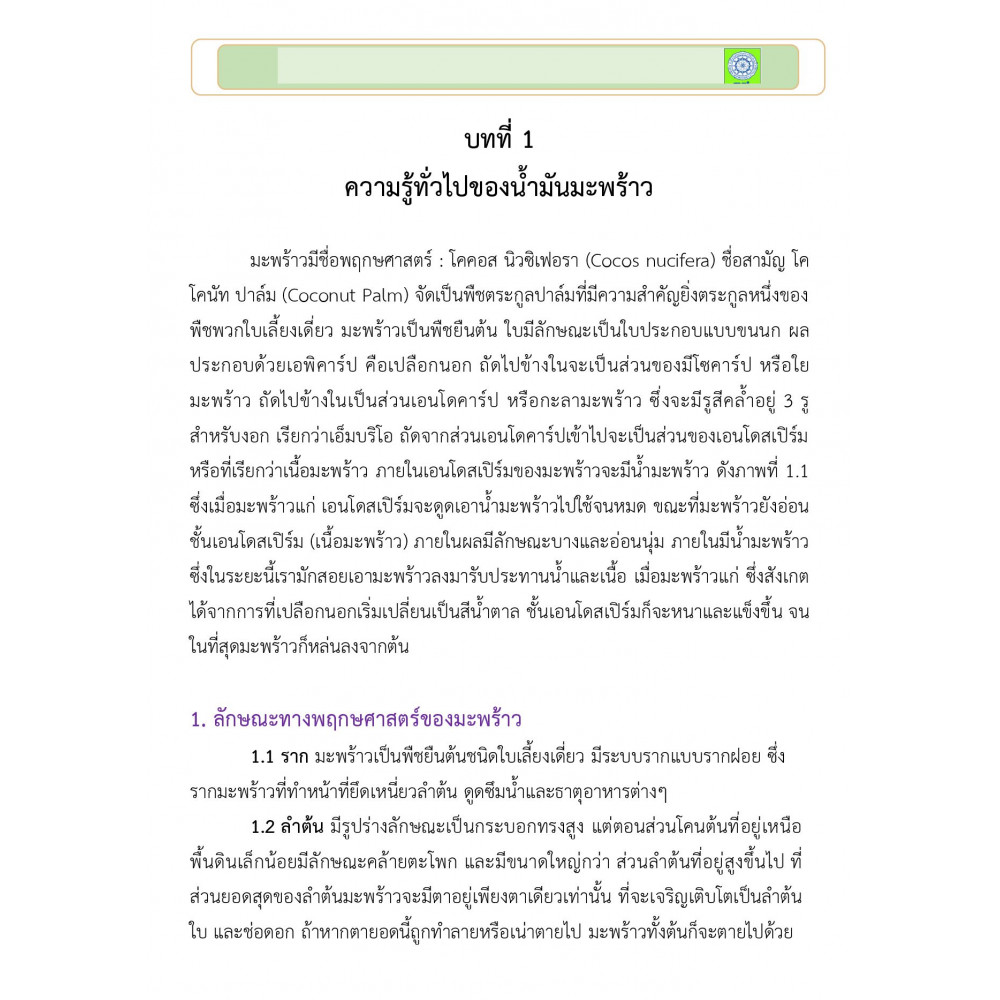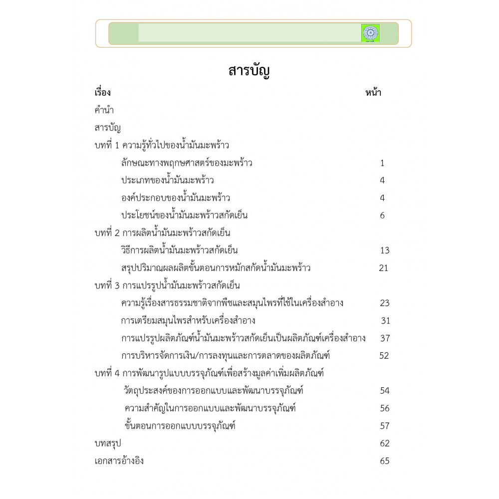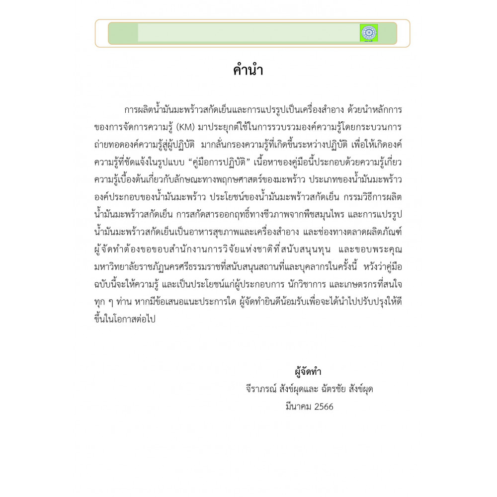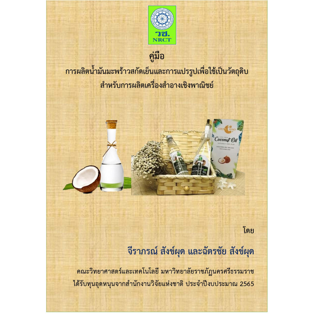 การผลิตน้ํามันมะพร้าวสกัดเย็นและการแปรรูปเป็นเครื่องสําอาง ด้วยนําหลักการ ของการจัดการความรู้ (KM) มาประยุกต์ใช้ในการรวบรวมองค์ความรู้โดยกระบวนการ ถ่ายทอดองค์ความรู้สู่ผู้ปฏิบัติ มากลั่นกรองความรู้ที่เกิดขึ้นระหว่างปฏิบัติ เพื่อให้เกิดองค์ ความรู้ที่ชัดแจ้งในรูปแบบ “คู่มือการปฏิบัติ” เนื้อหาของคู่มือนี้ประกอบด้วยความรู้เกี่ยว ความรู้เบื้องต้นเกี่ยวกับลักษณะทางพฤกษศาสตร์ของมะพร้าว ประเภทของน้ํามันมะพร้าว องค์ประกอบของน้ํามันมะพร้าว ประโยชน์ของน้ํามันมะพร้าวสกัดเย็น กรรมวิธีการผลิต น้ํามันมะพร้าวสกัดเย็น การสกัดสารออกฤทธิ์ทางชีวภาพจากพืชสมุนไพร และการแปรรูป น้ํามันมะพร้าวสกัดเย็นเป็นอาหารสุขภาพและเครื่องสําอาง และช่องทางตลาดผลิตภัณฑ์ ผู้จัดทําต้องขอขอบสํานักงานการวิจัยแห่งชาติที่สนับสนุนทุน และขอบพระคุณ มหาวิทยาลัยราชภัฏนครศรีธรรมราชที่สนับสนุนสถานที่และบุคลากรในครั้งนี้ หวังว่าคู่มือ ฉบับนี้จะให้ความรู้ และเป็นประโยชน์แก่ผู้ประกอบการ นักวิชาการ และเกษตรกรที่สนใจ ทุก ๆ ท่าน หากมีข้อเสนอแนะประการใด ผู้จัดทํายินดีน้อมรับเพื่อจะได้นําไปปรับปรุงให้ดี ขึ้นในโอกาสต่อไป