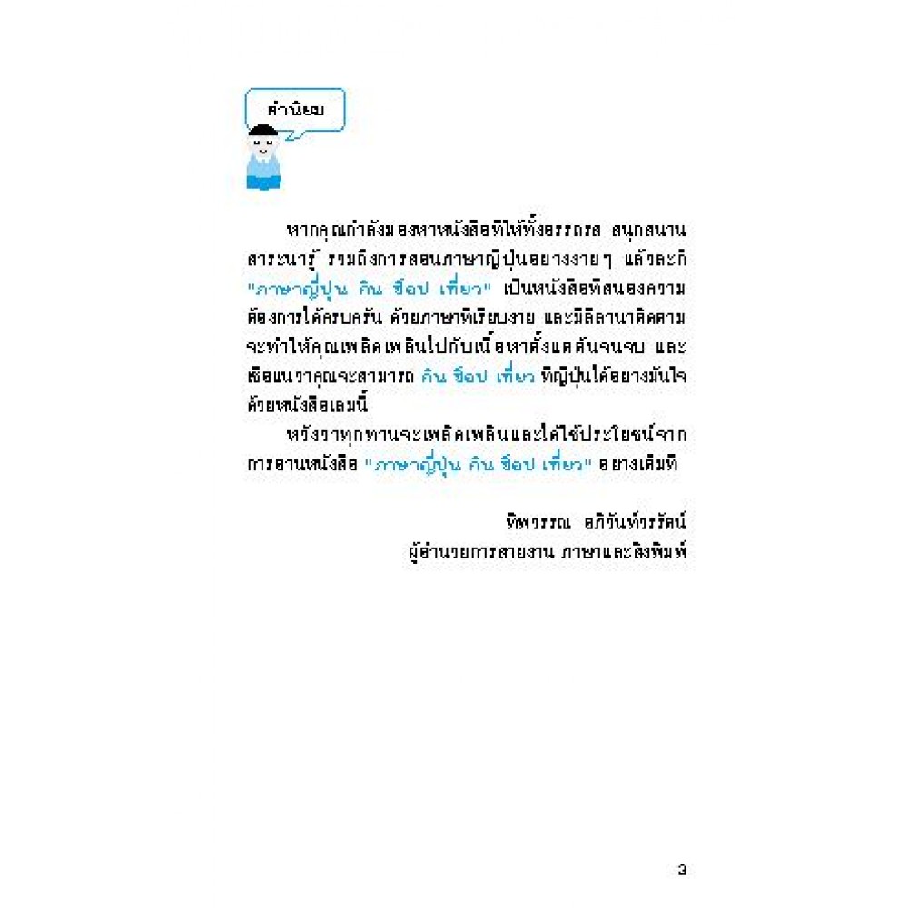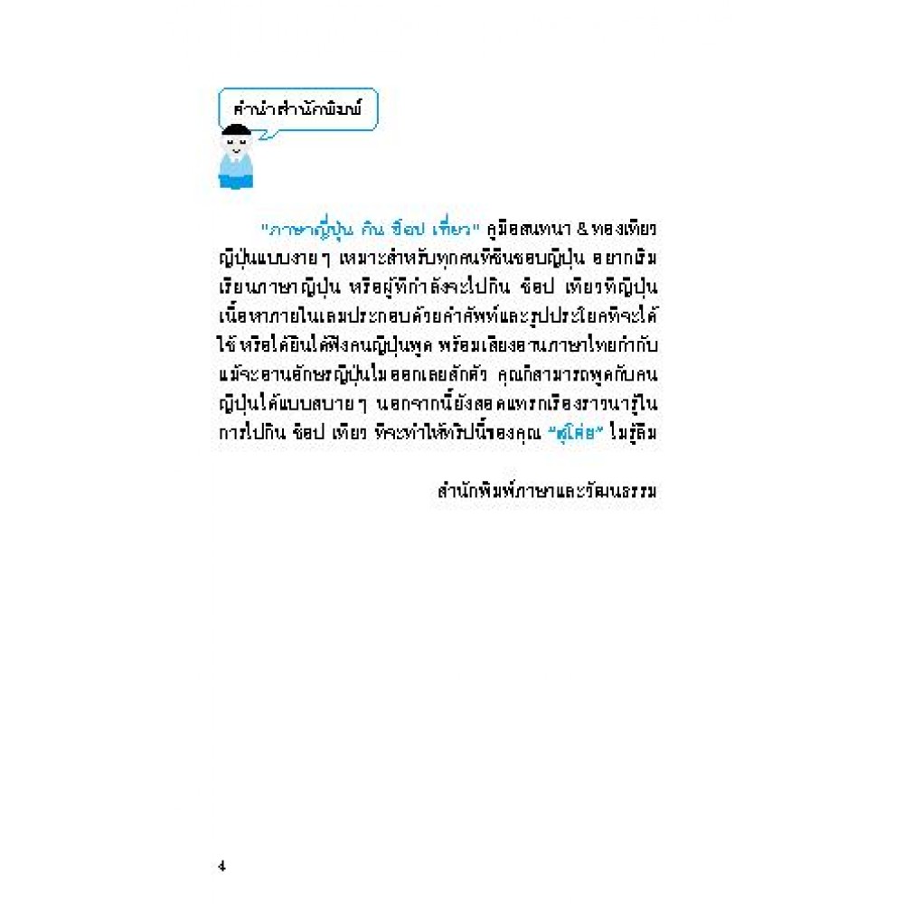 คู่มือฉบับกระเป๋าสำหรับผู้ที่ต้องการไปเที่ยวหรือไปใช้ชีวิตที่ญี่ปุ่น สามารถสื่อสารด้วยภาษาญี่ปุ่นแบบง่าย ๆ ได้ ไม่ว่าจะเป็นสำนวนและคำศัพท์ที่ใช้หรือพบบ่อยในการท่องเที่ยวตามสถานที่ต่าง ๆ หรือในชีวิตประจำวัน โดยเฉพาะเรื่อง "กิน ช็อป เที่ยว"