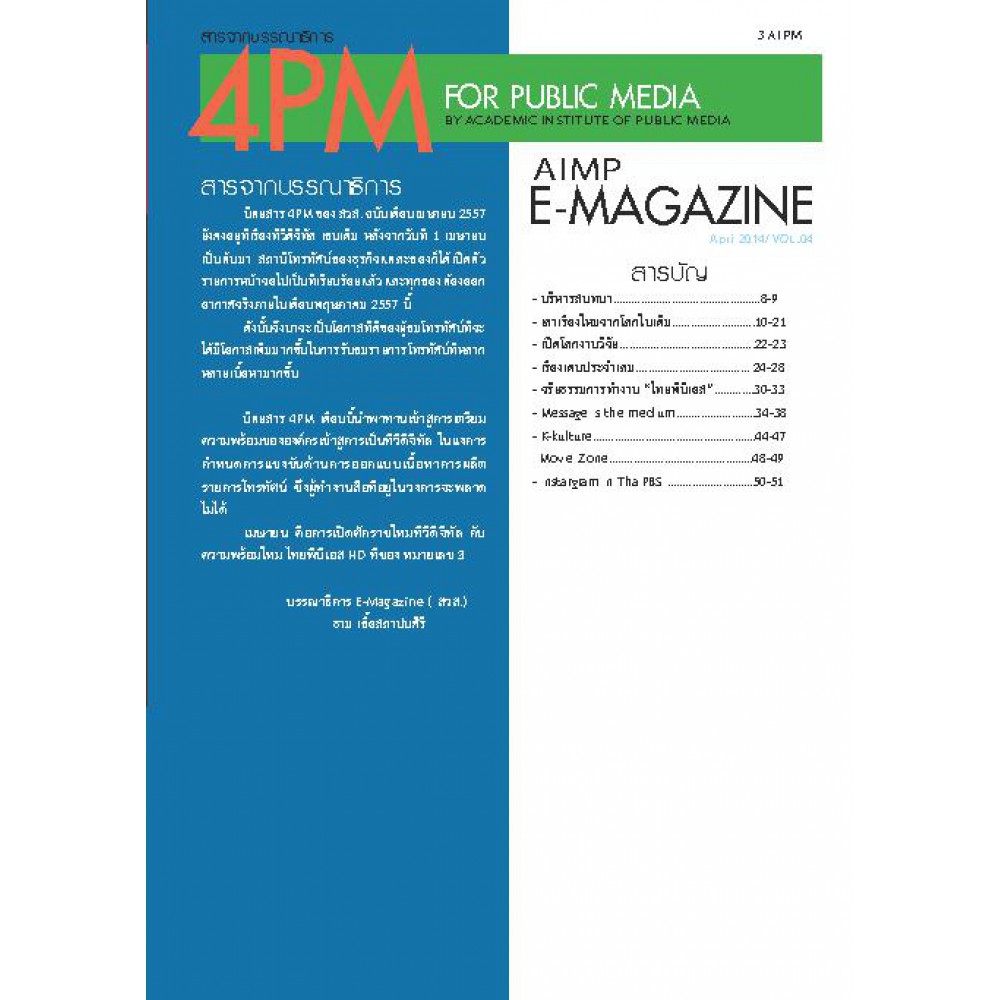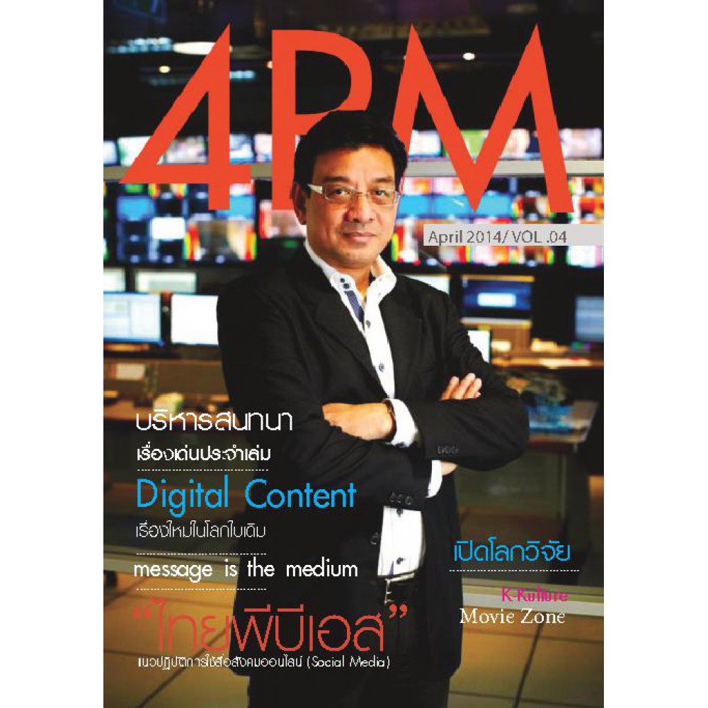 นิตยสาร 4PM ฉบับเดือนเมษายน เปิดศักราช 1 เมษายน 2557 "ทีวีดิจิตอล" กับความพร้อมของไทยพีบีเอส HD ภาคพื้นดินที่ช่อง หมายเลข 3 ในแง่การกำหนดการแข่งขัน ด้านการออกแบบ เนื้อหาการผลิตรายการโทรทัศน์ ซึ่งผู้ทำงานสื่อที่อย
