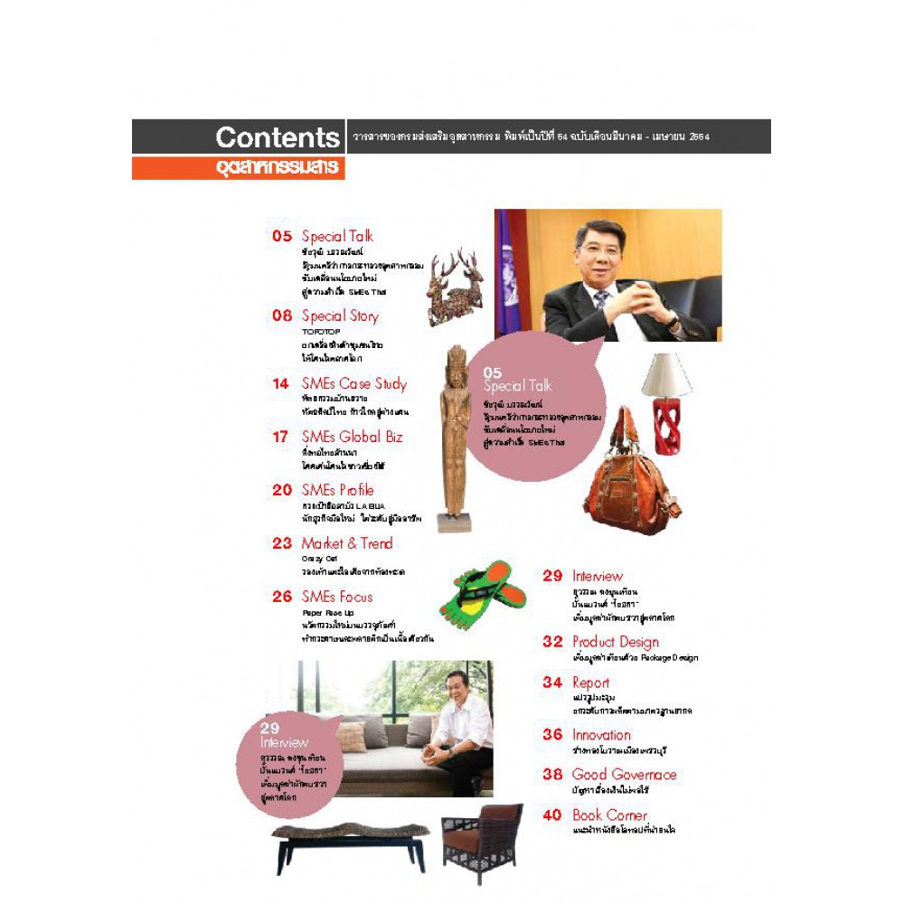 วารสารอุตสาหกรรมสารแต่ละฉบับ บรรจุเนื้อหาของอุตสาหกรรม โดยครอบคลุมเนื้อหาเกี่ยวกับสภาวะทั่วไปของอุตสาหกรรมนั้น การผลิต การตลาด รูปแบบผลิตภัณฑ์ เว็บไซต์ที่เกี่ยวข้องกับอุตสาหกรรม การบริหาร การจัดการ และความสำเร็จของผู้ประกอบการ