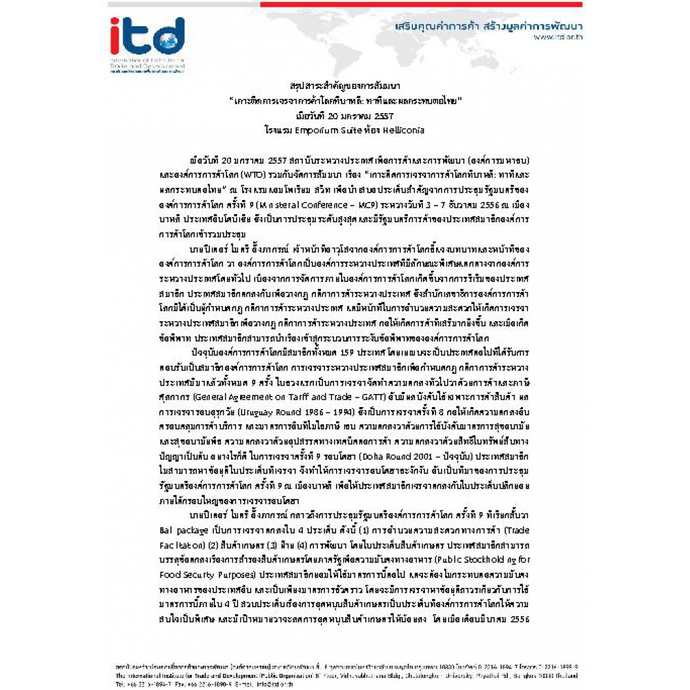 สรุปสาระสำคัญของการสัมมนา “เกาะติดการเจรจาการค้าโลกที่บาหลี: ท่าทีและผลกระทบต่อไทย” เมื่อวันที่ 20 มกราคม 2557 โรงแรม Emporium Suite ห้อง Helliconia